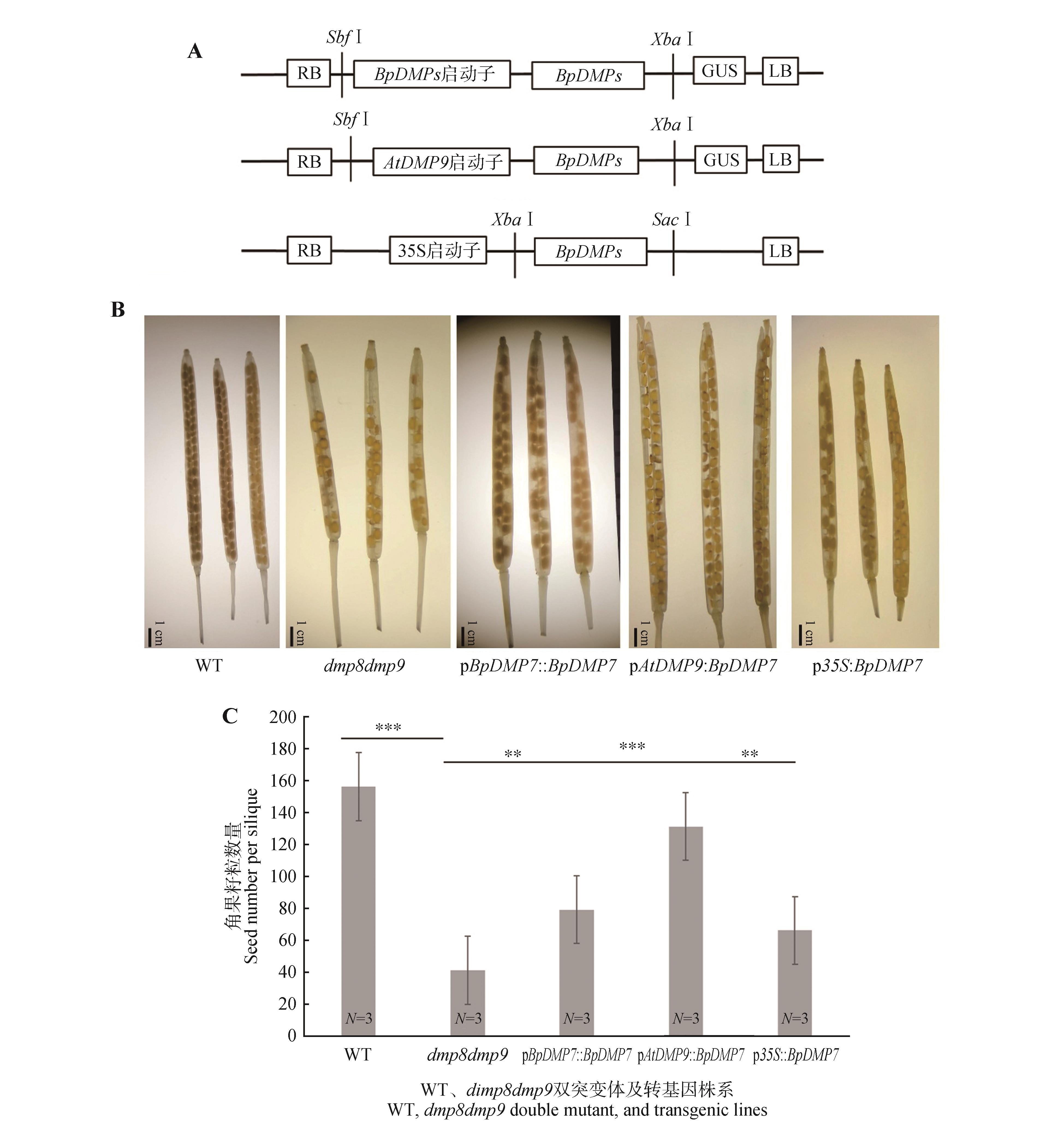 Birch(Betula platyphylla), as a perennial woody plant, is difficult to obtain homozygous plants and families due to its long growth cycle and complex genotype, which leads to slow progress in its breeding work. Double haploid breeding technology is a breeding method that has emerged in recent years. It only requires two generations to obtain homozygous plant families. Therefore, double haploid breeding technology can greatly shorten the process of forest breeding and obtain homozygous families, while the discovery and application of the DMP gene has opened up a new research direction in doubled haploid breeding. This article aimed to study the BpDMPs gene family in birch, and revealed its physicochemical properties, protein structure, systematic evolution, gene structure, chromosome distribution, and potential functions in the growth and development process of birch through bioinformatics analysis; to identify the birch DMP gene with haploid induction function in the gene family through expression pattern analysis, and verify the gene function through Arabidopsis complementation experiments. The bioinformatics analysis results showed that birch contained 14 gene family members, distributed on six chromosomes. Phylogenetic analysis showed that 14 genes in the BpDMPs gene family belonged to five branches. The predictive analysis of cis-acting elements in the promoter of the BpDMPs gene family showed that the promoter contained response elements related to growth and development, hormone metabolism, stress response, and so on. The qRT-PCR results showed that there were significant differences in the expression levels of BpDMPs in various tissues of birch, with BpDMP2 and BpDMP7 having higher expression levels in the stamens. Through Arabidopsis complementation experiments, it was demonstrated that the BpDMP7 gene can replenish the phenotype of Arabidopsisdmp8dmp9 mutant grain sterility. This article provided basic information for further studying the functions and regulatory mechanisms of the BpDMPs gene family, and offered a new perspective for understanding the roles these genes play in plant growth, development, and environmental adaptation processes.