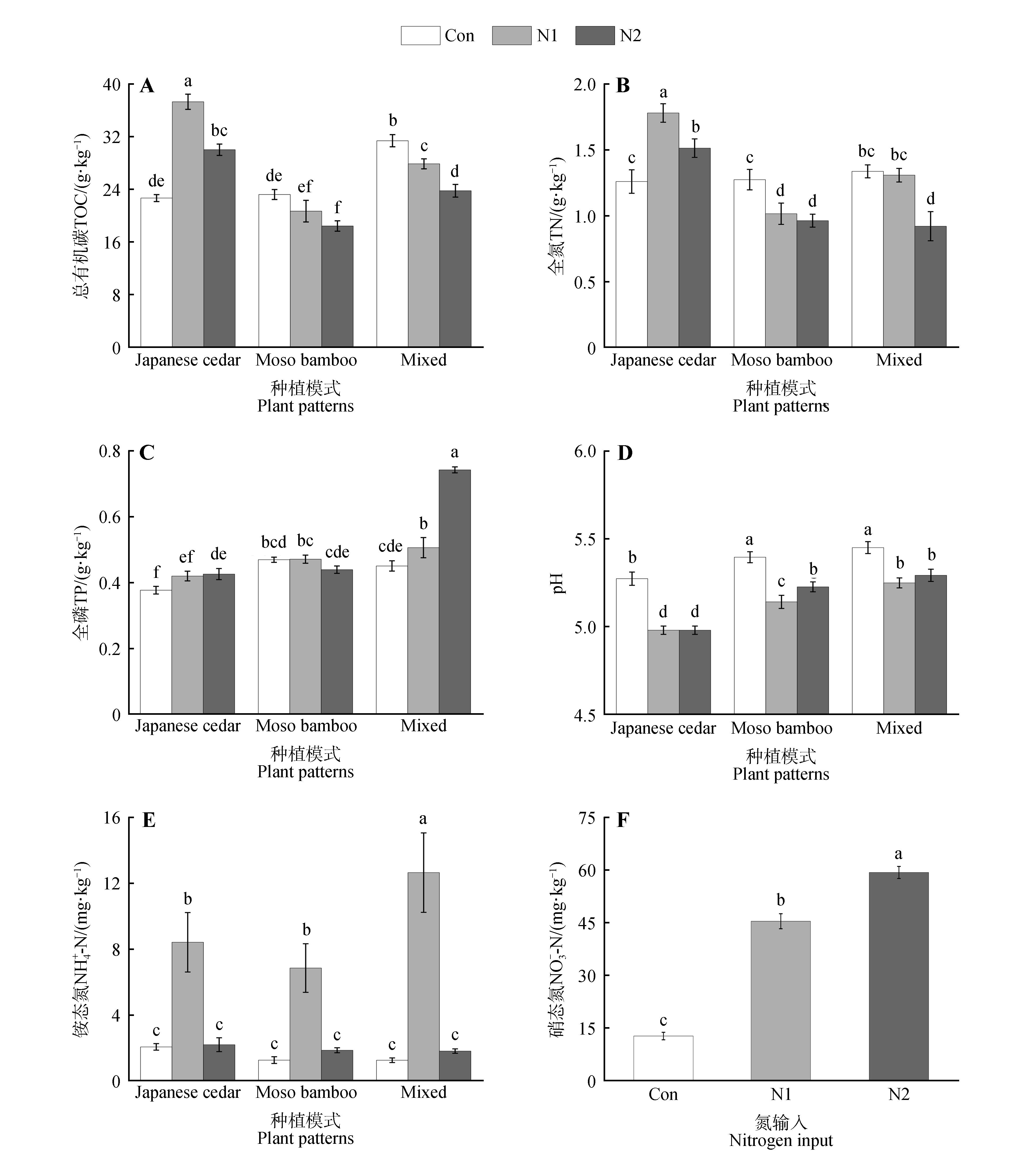 氮输入、微生物调控及种植模式对日本柳杉和毛竹土壤养分含量影响的方差分析