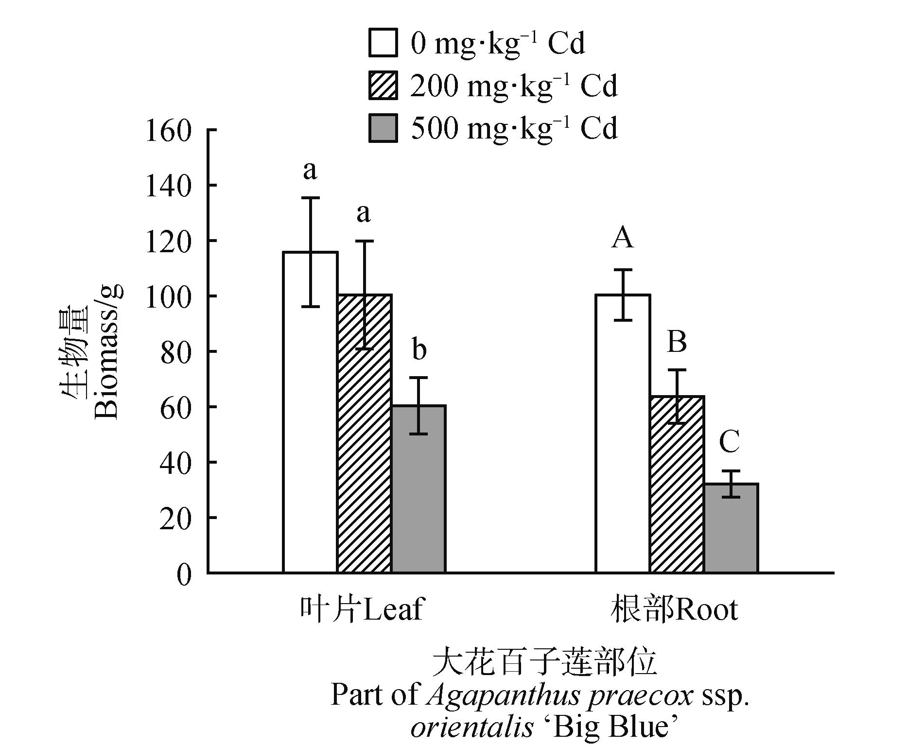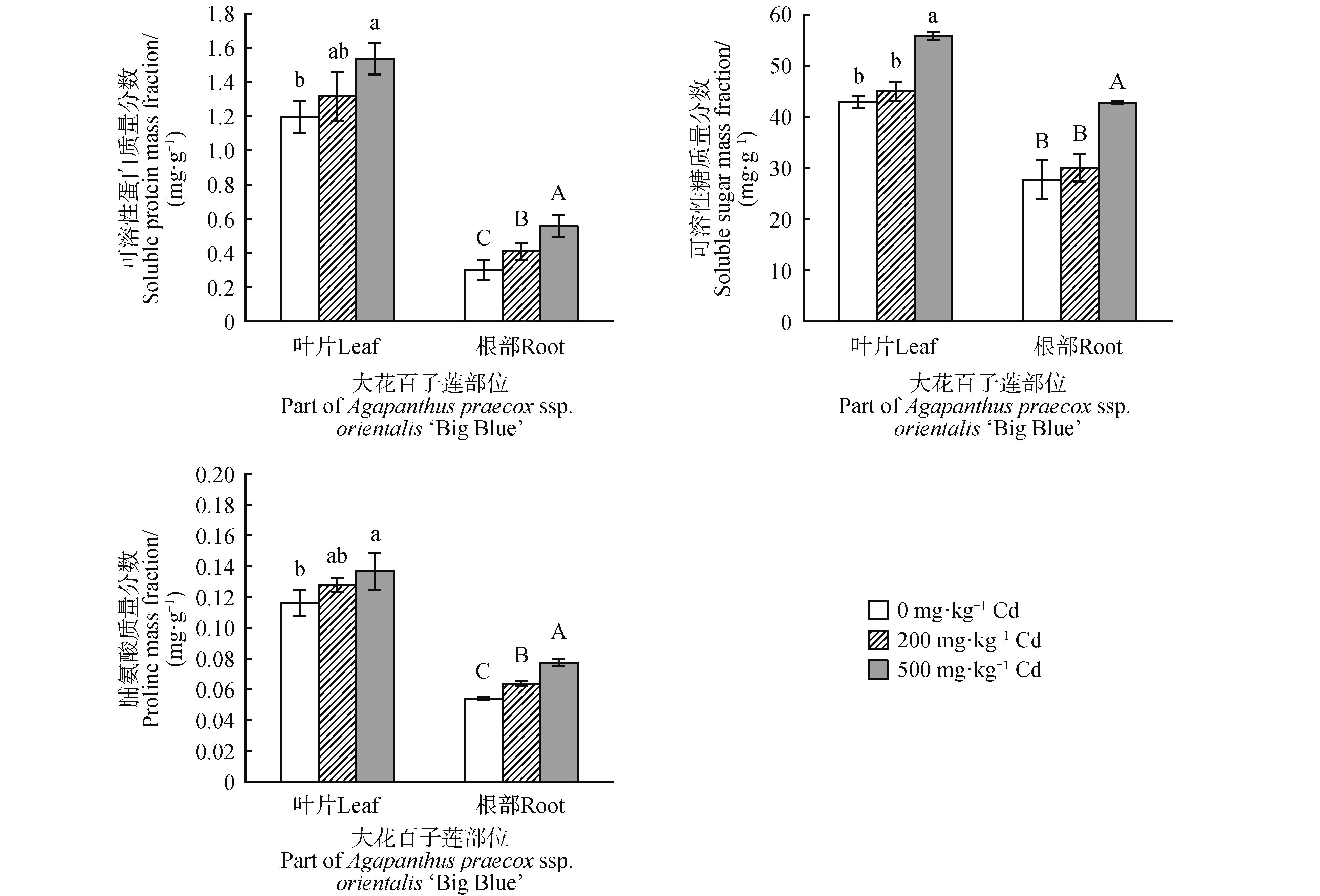 为了给镉(Cd)污染土壤修复提供具有景观效果的植物材料,该试验采用盆栽方法,研究土壤中不同质量分数(0、200、500 mg·kg-1)外源镉添加对大花百子莲(Agapanthus praecox ssp. orientalis ‘Big Blue’)耐受性和富集特性的影响。结果表明:随着镉质量分数升高,大花百子莲叶片和根部的生物量有所下降,镉质量分数为200 mg·kg-1时,与对照相比,叶片生物量下降不显著,而根部生物量显著下降。与对照相比,叶片的过氧化氢酶、过氧化物酶、超氧化物歧化酶活性及丙二醛、可溶性蛋白、脯氨酸含量在镉质量分数为500 mg·kg-1时显著提高,根部相应的指标在镉质量分数为200 mg·kg-1时显著提高;叶片和根部的可溶性糖含量在镉质量分数为500 mg·kg-1时显著提高。上述结果说明:大花百子莲对重金属镉有一定的耐受性,根部较叶片对镉胁迫更敏感。500 mg·kg-1镉胁迫下,叶绿素a、叶绿素b、叶绿素a+b含量、叶绿素a/b、类胡萝卜素含量显著低于对照;除胞间CO2摩尔分数外,蒸腾速率、光合速率、气孔导度显著低于对照;除非光化学淬灭系数(NPQ)外,最大光化学效率(Fv/Fm)、PSⅡ潜在活性(Fv/Fo)、实际光化学效率(ΦPSⅡ)、光化学淬灭系数(qP)有所减少,显著低于对照。镉胁迫下,大花百子莲叶片和根部的富集系数小于1,转运系数大于1,不完全符合镉超积累植物标准,但对镉具有很强的富集作用。综上,大花百子莲在镉质量分数低于200 mg·kg-1时,能通过自身调节来维持正常生长,对镉胁迫具有一定耐受性和富集性,可以作为具有景观效果的植物修复材料,并且大花百子莲叶片和根部的生物量及镉含量4个指标可以作为衡量镉胁迫耐受性的重要指标。