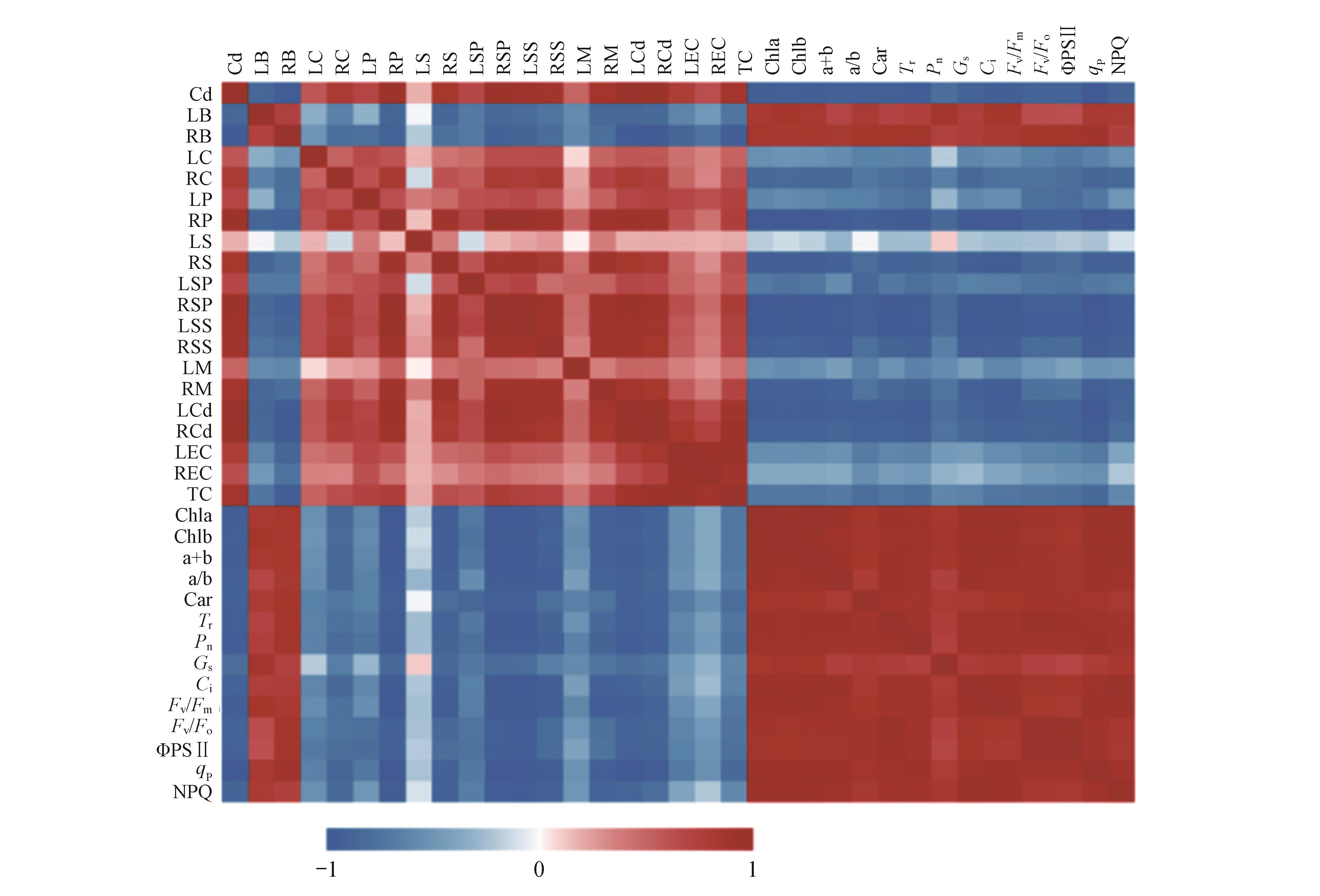 镉胁迫下大花百子莲各指标相关性Cd. 镉质量分数;LB. 叶片生物量;RB. 根部生物量;LC. 叶片过氧化氢酶活性;RC. 根部过氧化氢酶活性;LP. 叶片过氧化物酶活性;RP. 根部过氧化物酶活性;LS. 叶片超氧化物歧化酶活性;RS. 根部超氧化物酶活性;LSP. 叶片可溶性蛋白含量;RSP. 根部可溶性蛋白含量;LSS. 叶可溶性糖含量;RSS. 根可溶性糖含量;LM. 叶丙二醛含量;RM. 根丙二醛含量;LCd. 叶镉质量分数;RCd. 根镉质量分数;LEC. 叶富集系数;REC. 根富集系数;TC. 转运系数;Chla. 叶绿素a含量;Chlb. 叶绿素b含量;a+b. 叶绿素a+b含量;a/b. 叶绿素a/b;Car. 类胡萝卜素含量;Tr. 蒸腾速率;Pn. 光合速率;Gs. 气孔导度;Ci. 胞间二氧化碳摩尔分数;Fv/Fm. 最大光化学效率;Fv/Fo. PSⅡ潜在活性;ΦPSⅡ. 实际光化学效率;qP. 光化学淬灭系数;NPQ. 非光化学淬灭系数。