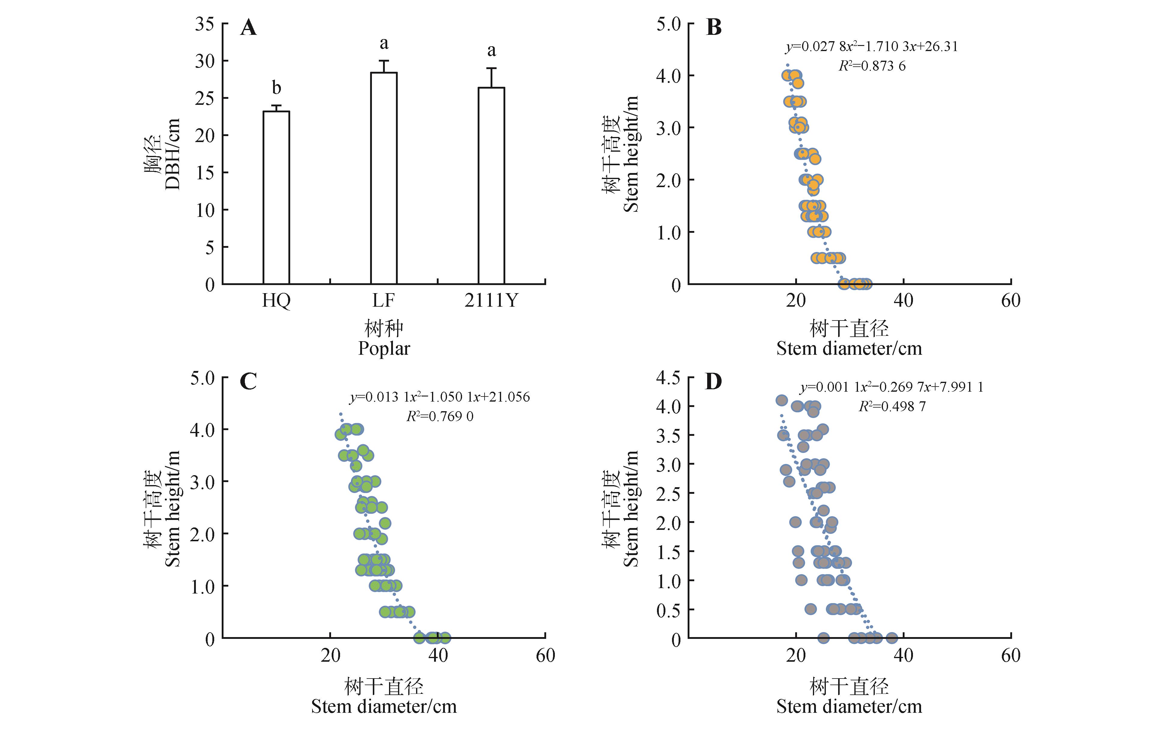 Radial growth rate and model of stem height and the corresponding diameter of three poplar varieties grown in west Songnen PlainA. Diameter at breast height of HQ,LF,2111Y;B. Poplar HQ;C. LF;D. 2111Y. Different lowercase letters indicated significant difference between poplar varieties at P<0.05.