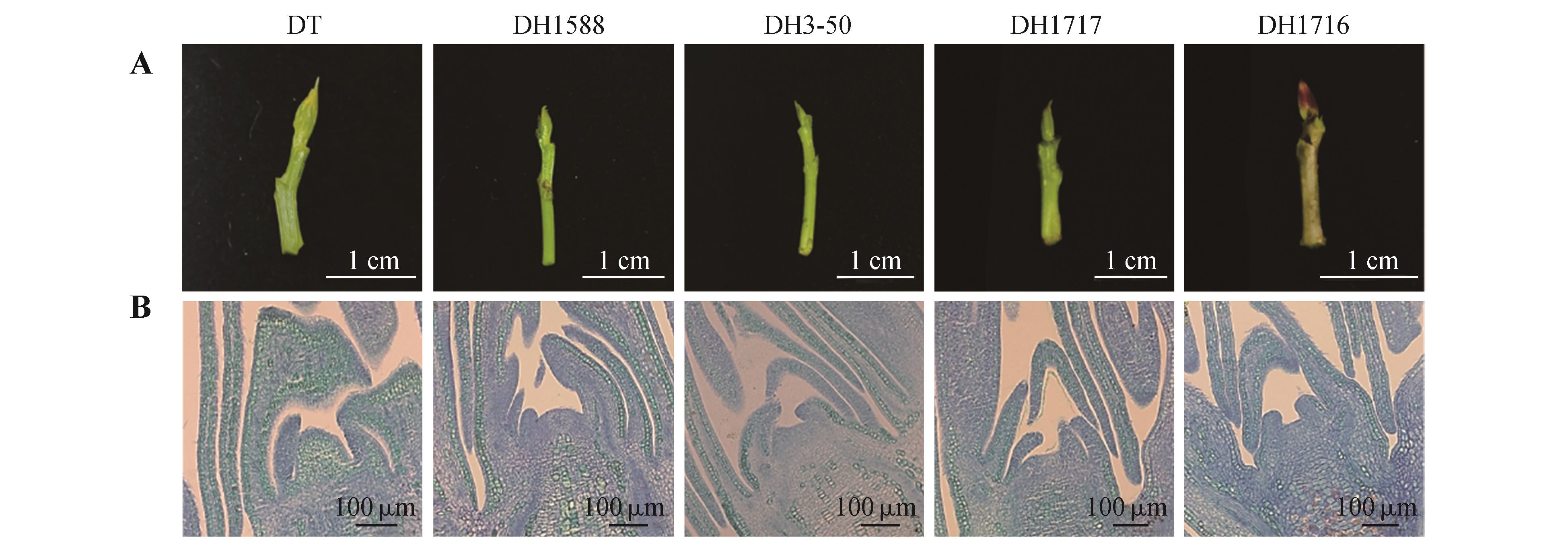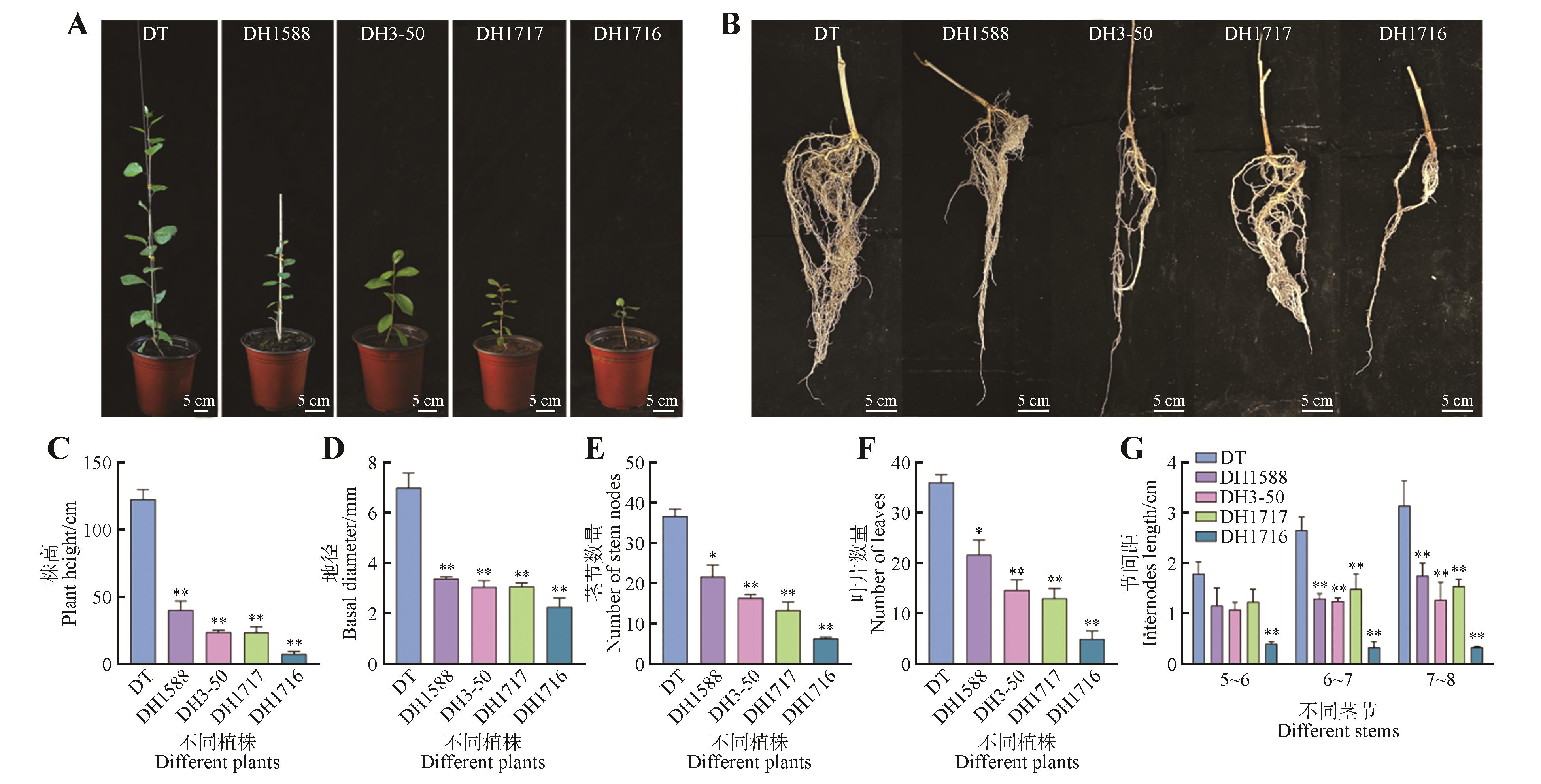 Phenotypic observation and growth indexes of 4-month-old DT and DH linesA. Aboveground part;B. Underground part;C. Plant height;D. Basal diameter;E. Number of stem nodes;F. Number of leaves;G. 5-8 stem internodes length;DT. Donor tree. *,** represented a significant difference at the 0.05 and 0.01 level, respectively.