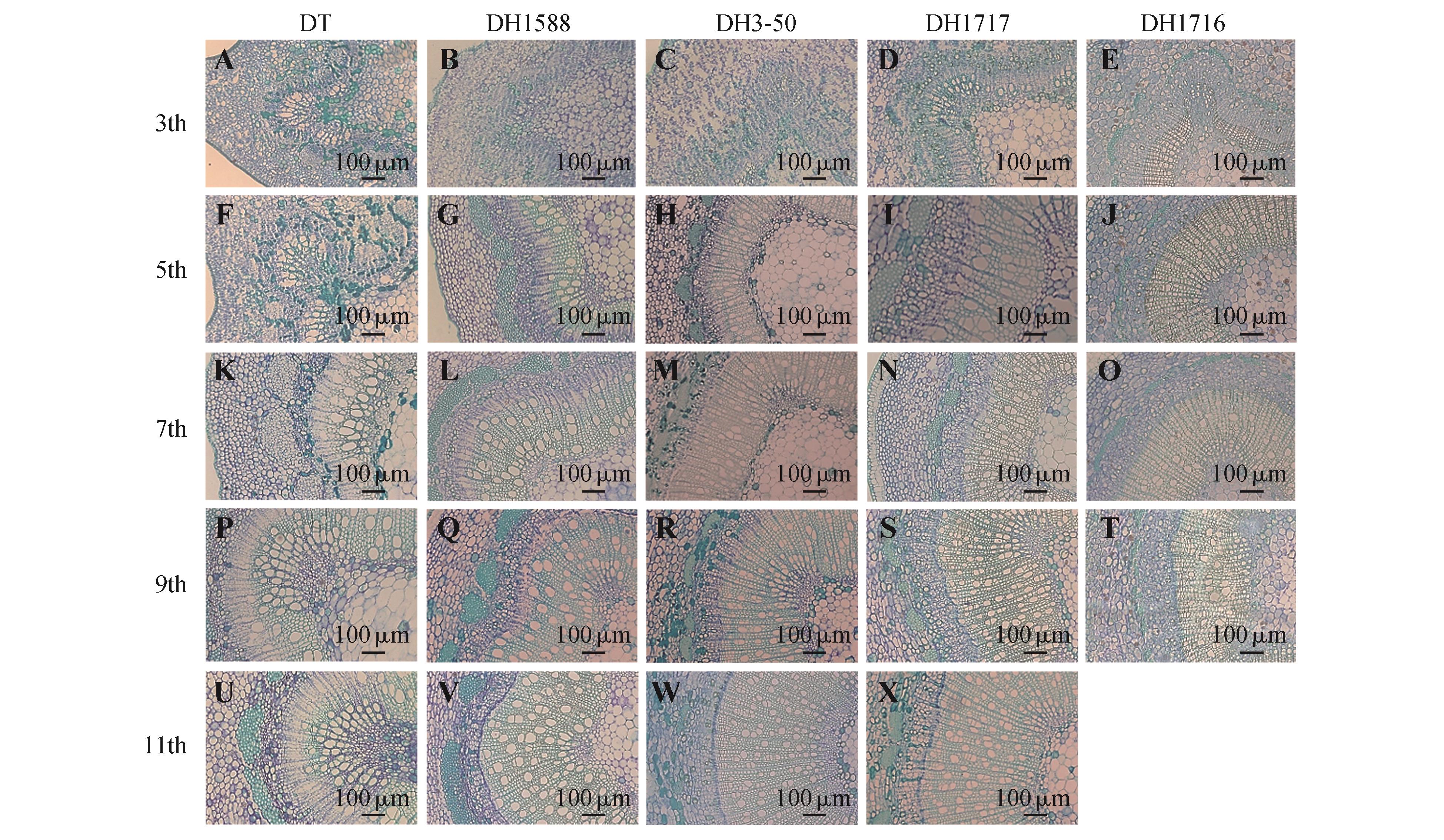 The toluidine blue staining of stem nodes of DT and DH linesA-E. Anatomical diagrams of the 3rd stem node of P. simonii × P. nigra parents and different DH lines;F-J. Anatomical diagrams of the 5th stem node of P. simonii × P. nigra parents and different DH lines;K-O. Anatomical diagrams of the 7th stem node of P. simonii × P. nigra parents and different DH lines;P-T. Anatomical diagrams of the 9th stem node of P. simonii × P. nigra parents and different DH lines;U-X. Anatomical diagrams of the 11th stem node of P. simonii × P. nigra parents and different DH lines;DT. Donor tree.