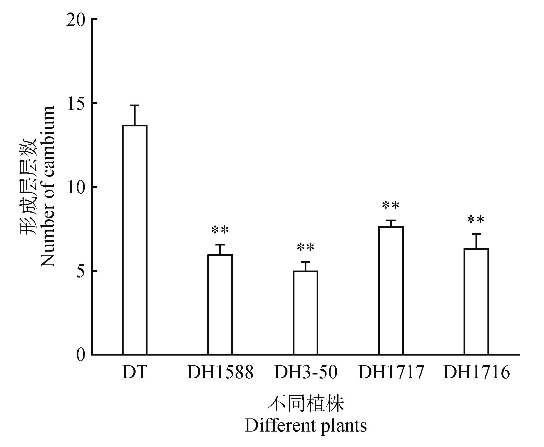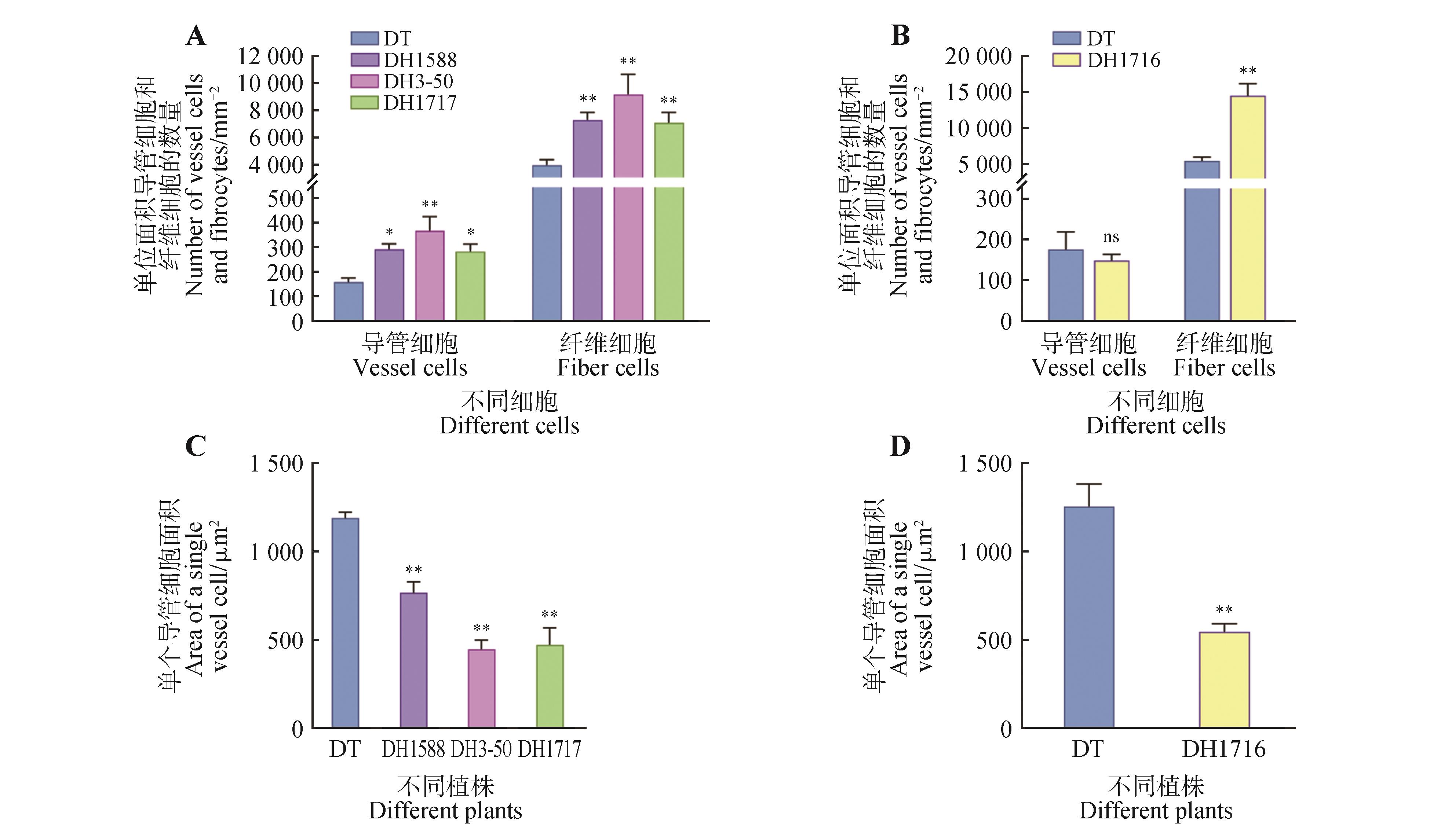 Statistics of vessel and fiber cells per unit area of stem segments of DT and DH linesA. The number of vessel cells and fiber cells per unit area (mm2) at the 11th stem node of DT,DH1588,DH3-50,and DH1717;B. The number of vessel cells and fiber cells per unit area (mm2) at the 9th stem node of DT and DH1716;C. The area of a single vessel cell at the 11th stem node (μm2) of DT,DH1588,DH3-50,and DH1717;D. The area of a single vessel cell at the 9th stem node (μm2) of DT and DH1716;DT. Donor tree.*,** represented a significant difference at the 0.05 and 0.01 level,respectively. ns. No significant difference.