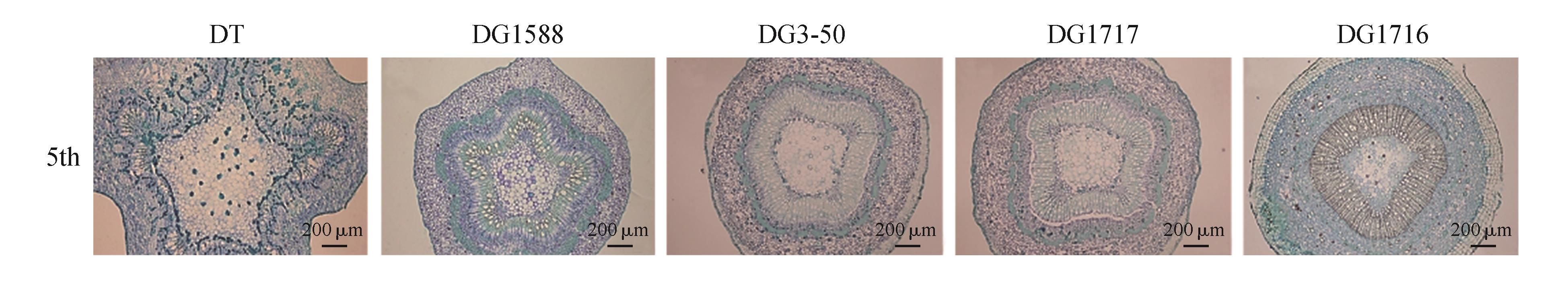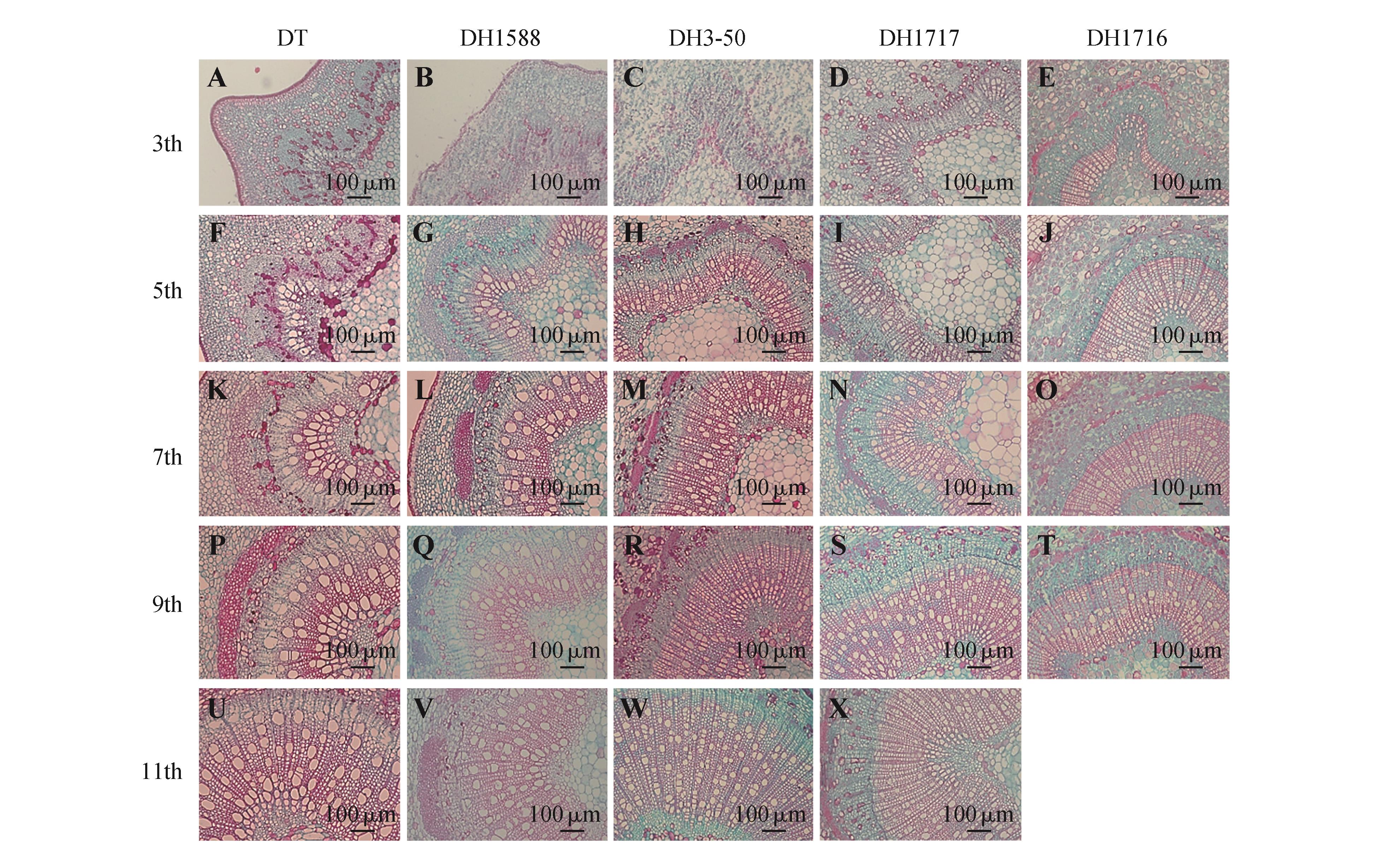 The safranin-fast green staining of the stem nodes of DT and DH linesA-E. Anatomical diagrams of the 3rd stem internode of P. simonii × P. nigra parents and different DH lines;F-J. Anatomical diagrams of the 5th stem internode of P. simonii × P. nigra parents and different DH lines;K-O. Anatomical diagrams of the 7th stem internode of P. simonii × P. nigra parents and different DH lines;P-T. Anatomical diagrams of the 9th stem internode of P. simonii × P. nigra parents and different DH lines;U-X. Anatomical diagrams of the 11th stem internode of P. simonii × P. nigra parents and different DH lines;DT. Donor tree.