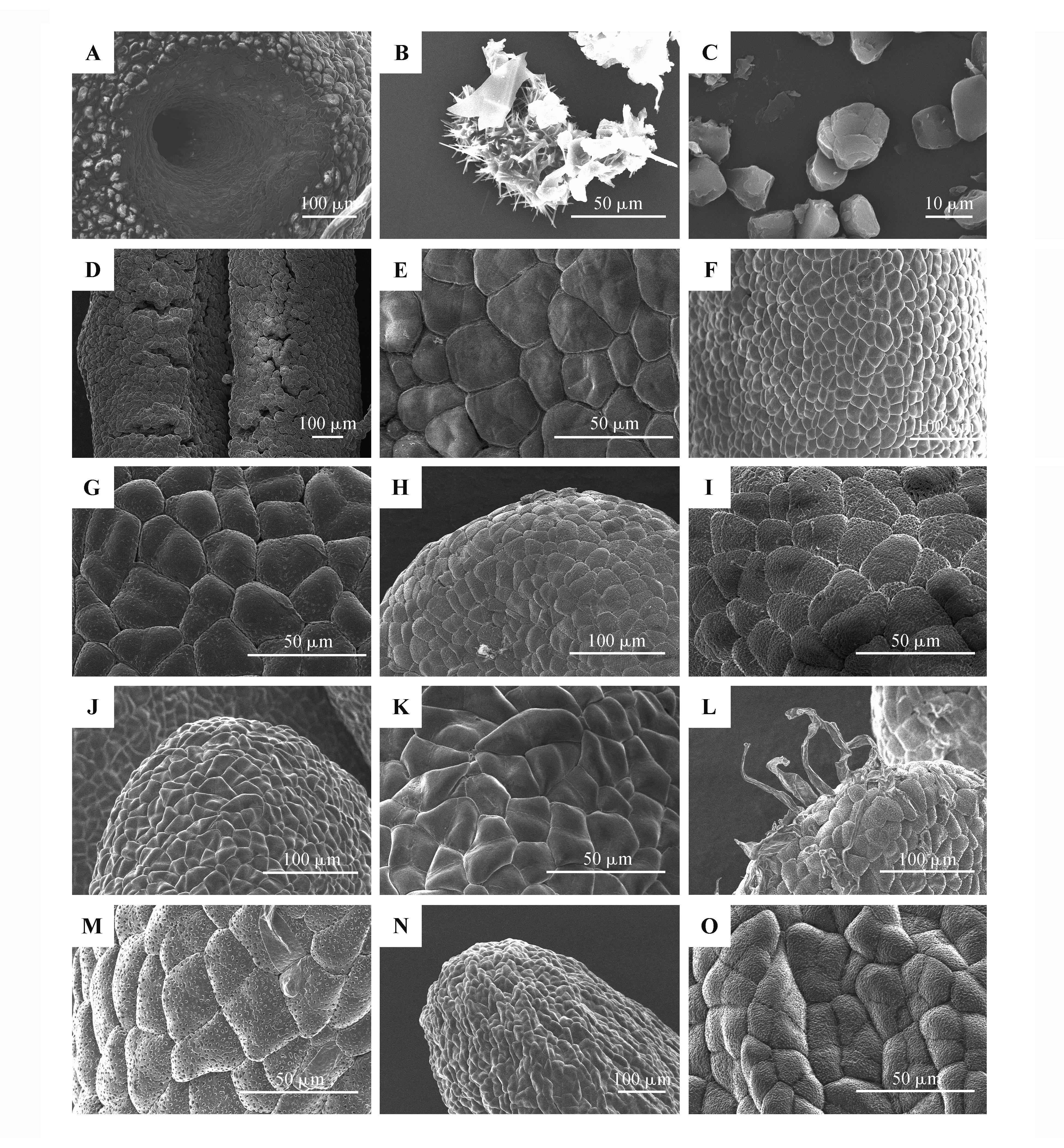 In order to provide experimental basis for palynological and taxonomic studies of Orchidaceae, pollen morphological characteristics of 13 wild orchids from 10 genera in Mount Emei were investigated and compared by light microscopy and scanning electron microscopy. The results indicated the rich diversity of pollen morphology of wild orchids in Mount Emei, and the pollen morphology of species from three genera, HolcoglossumOdontochilus and Rhomboda were demonstrated for the first time. The properties of pollinium (granular, waxy), texture (granular pollinium, separable pollinium,hard pollinium), number (2,4,8), morphology (e.g., horseshoe shaped, crescent-shaped, obovoid, spherical, oblanceolate, clavate, etc.), surface structure (smooth but uneven, granular, rough, stripy, laminated, etc.) of pollinia, as well as the pollen dispersal units (tetrahedral pollen, massulae, pollinium) and their exine ornamentation (foveolate, fine reticulate, pitted, coarse reticulate, fine punctate, smooth, etc.) varied greatly among genera, while the pollen morphological characteristics of different species within the same genus shared certain features, but there were also specificities. There were significant differences in surface structure of pollinia and exine ornamentation of pollen dispersal units among the four species of the genus Calanthe. The results showed that pollen morphological characteristics was an important basis for identifying closely related species within and between genera of Orchidaceae. There was strong differentiation of orchids in Mount Emei, with a high proportion of endangered and endemic species. Therefore, it is necessary to strengthen research on the diversity of pollen characteristics of wild orchids in this area.