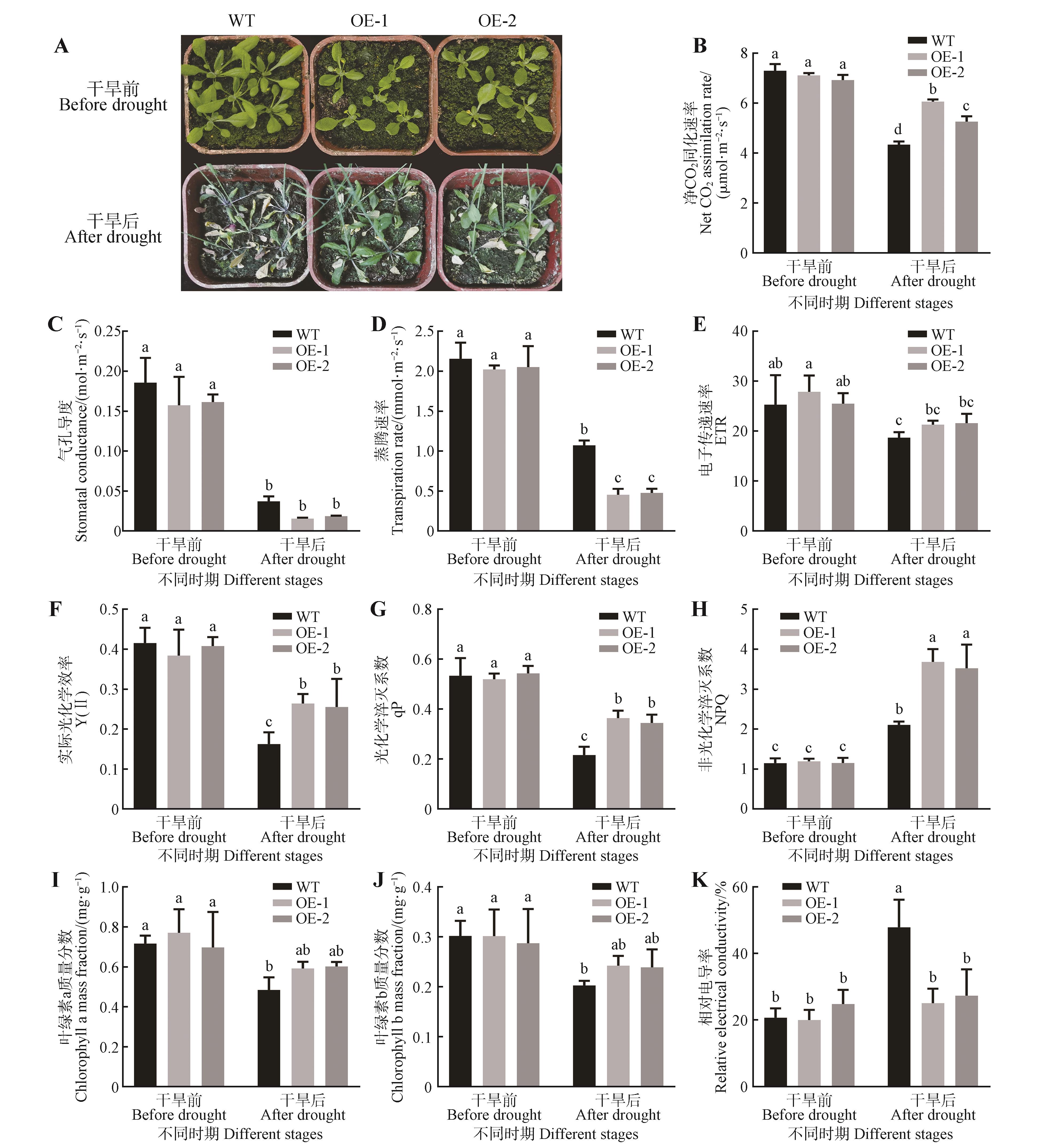 This study addressed the issue of growth suppression and mortality in poplar caused by increasing global drought, focusing on the R2R3-MYB transcription factor PtrMYB002 from Populus trichocarpa. Utilizing methods including gene cloning, expression vector construction, genetic transformation of Arabidopsis thaliana, and transient transformation in poplar, combined with bioinformatics analysis, subcellular localization, phenotypic observation, physiological index measurement, and gene expression analysis, we investigated its role in regulating plant growth and drought tolerance. The results showed that PtrMYB002 was localized in the nucleus and its expression was significantly induced by drought and ABA treatment. Overexpression of PtrMYB002 gene significantly inhibited the cotyledon area, hypocotyl length, root length, rosette diameter, above-ground fresh mass, and inflorescenced stem height in Arabidopsis, but enhanced its drought tolerance. Under drought conditions, the transgenic lines exhibited significantly higher net CO? assimilation rate, electron transport rate(ETR), actual photochemical efficiency(Y(Ⅱ)), photochemical quenching coefficient(qP), and non-photochemical quenching coefficient(NPQ), while the stomatal conductance, transpiration rate, and relative electrical conductivity were significantly lower compared to the wild-type(WT). Concurrently, the expression levels of drought-responsive genes AtRD29A and AtDREB2 were significantly upregulated in the transgenic lines. Furthermore, in the ‘84K’ poplar with transient overexpression of PtrMYB002 gene, the expression levels of PagRD29A and PagDREB2B genes were significantly higher than that in the control group, indicating that this regulatory mechanism was likely conserved in poplar. In conclusion, the overexpression of PtrMYB002 gene suppressed growth in Arabidopsis while enhancing its drought tolerance, demonstrating a potential role of the gene in participation of “growth and defense trade-off” strategy, and provided new genetic resources and a theoretical basis for molecular breeding of drought-tolerant poplar.