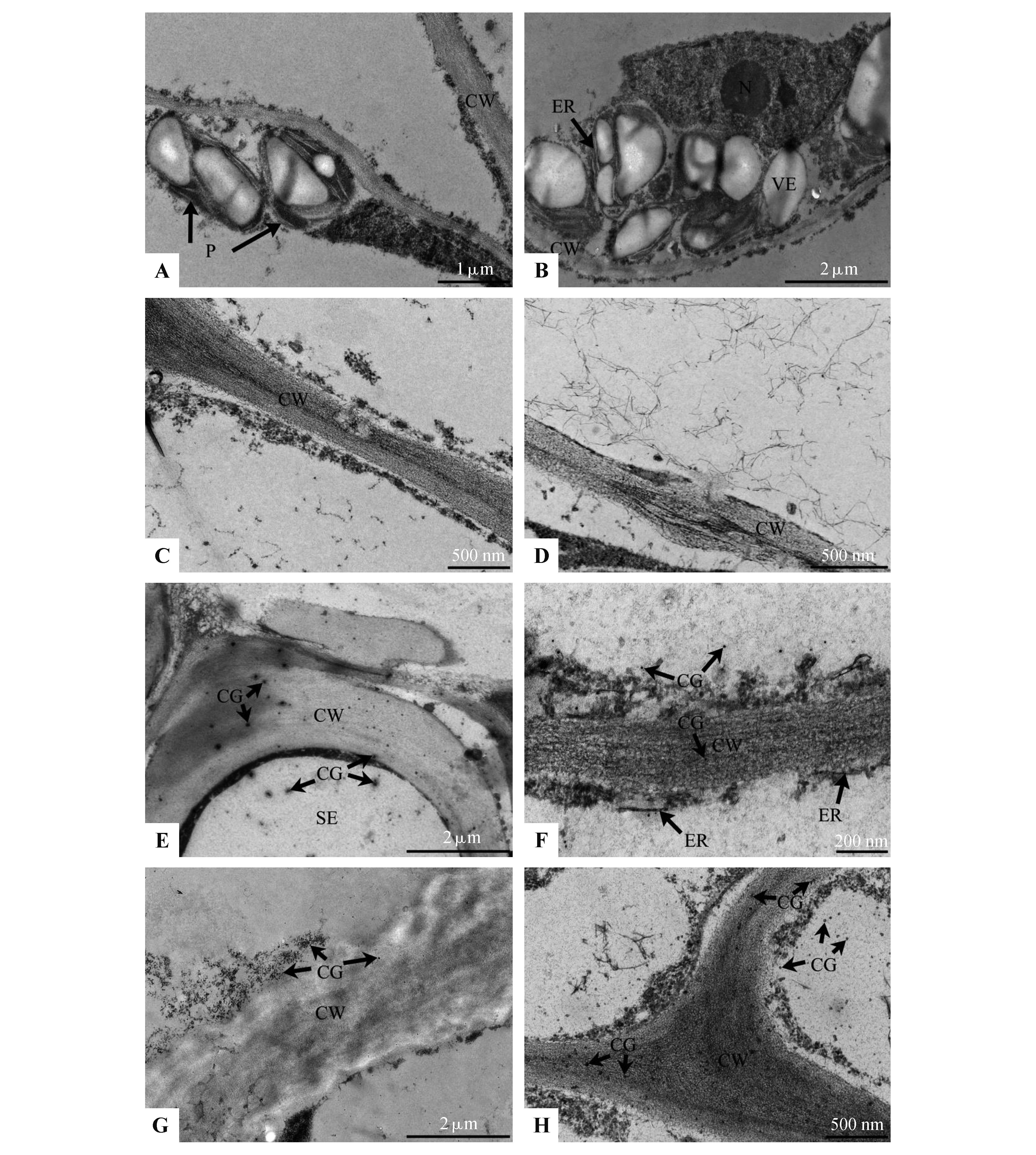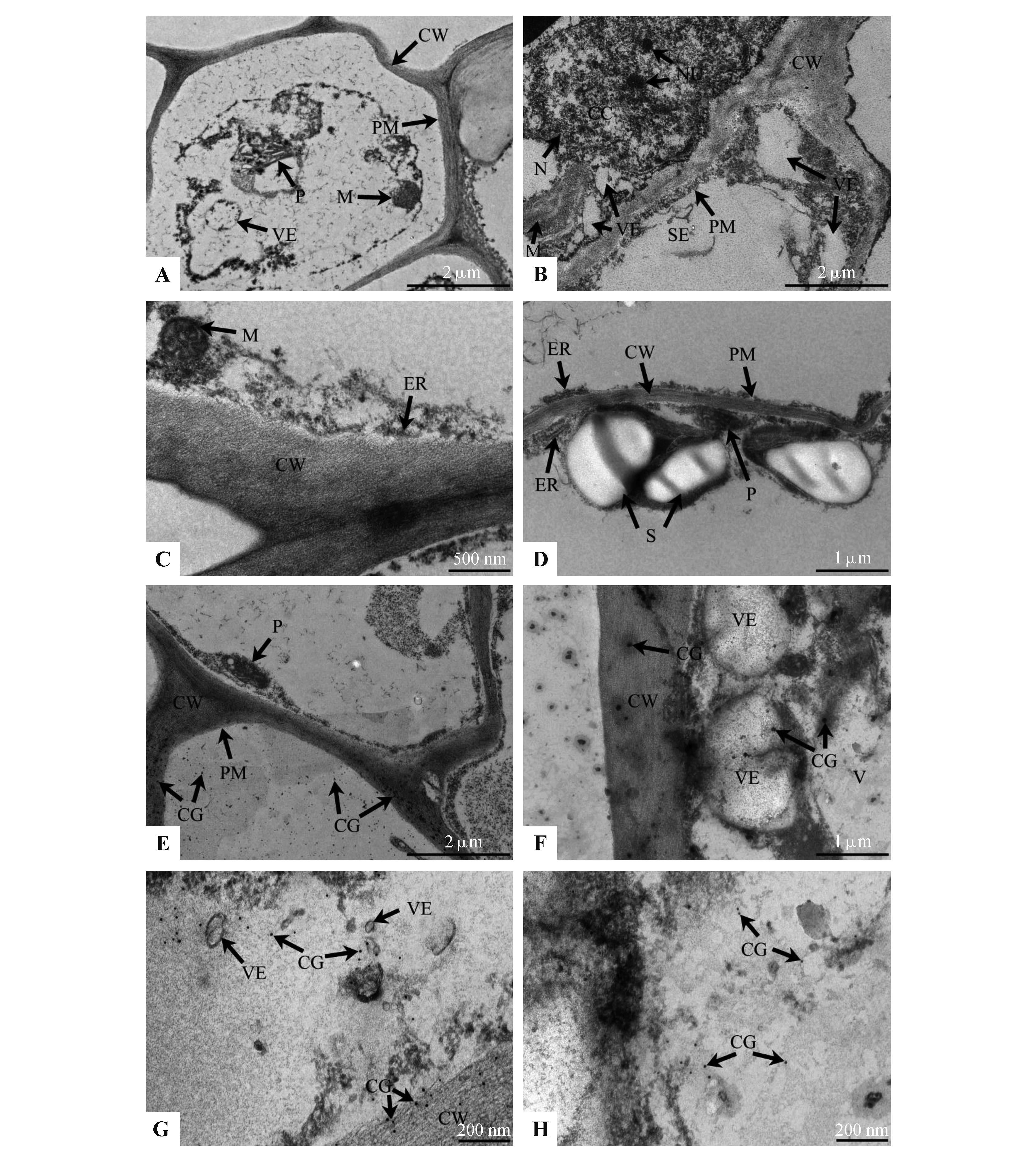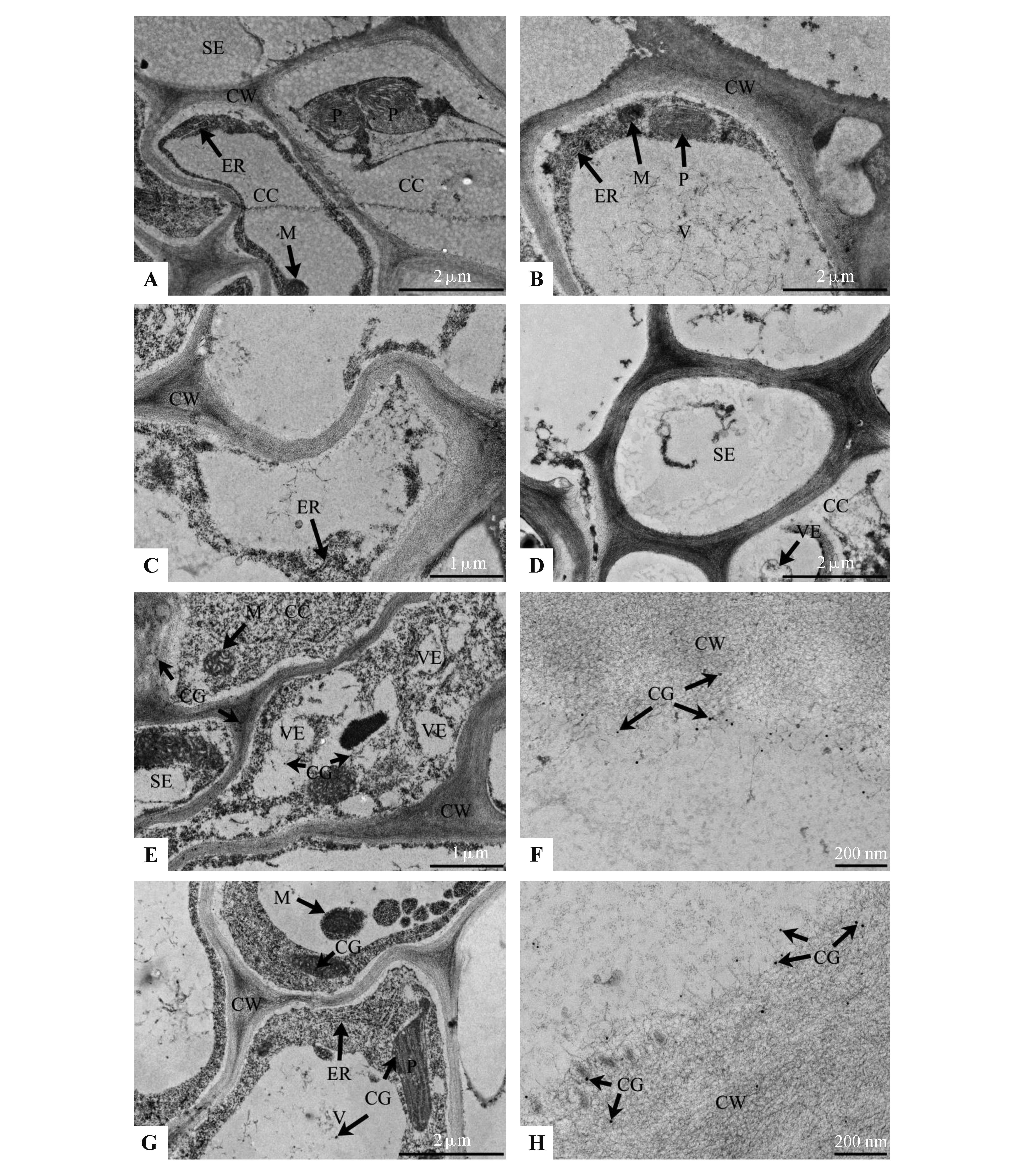Colloidal gold immunolocalization of AGPs in fruit in the early bulking periodA-D. Fruits unincubated with primary antibody; E-H. Fruits incubated with primary antibody. A-B. Phloem and parenchymal cells of vascular bundle and the organelles in them; C. Cell walls and organelles of the parenchymal cells of phloem; D. Organelles in the parenchymal cells of the phloem of vascular bundle; E. Cell walls and organelles of parenchymal cells distant from the vascular bundle; F. Cell walls and organelles of parenchymal cells in the phloem of the vascular bundle; G-H. Cell walls and cell interiors of parenchymal cells distant from the vascular bundle. SE. Sieve tube molecules; CC. Companion cells; VE. Vesicles; V. Vacuoles; ER. Endoplasmic reticulum; M. Mitochondria; N. Nucleus; P. Plastids; S. Starch grains; NU. Nucleoli; CW. Cell wall; PM. Plasma membrane; CG.Colloidal gold particles. The same as below.