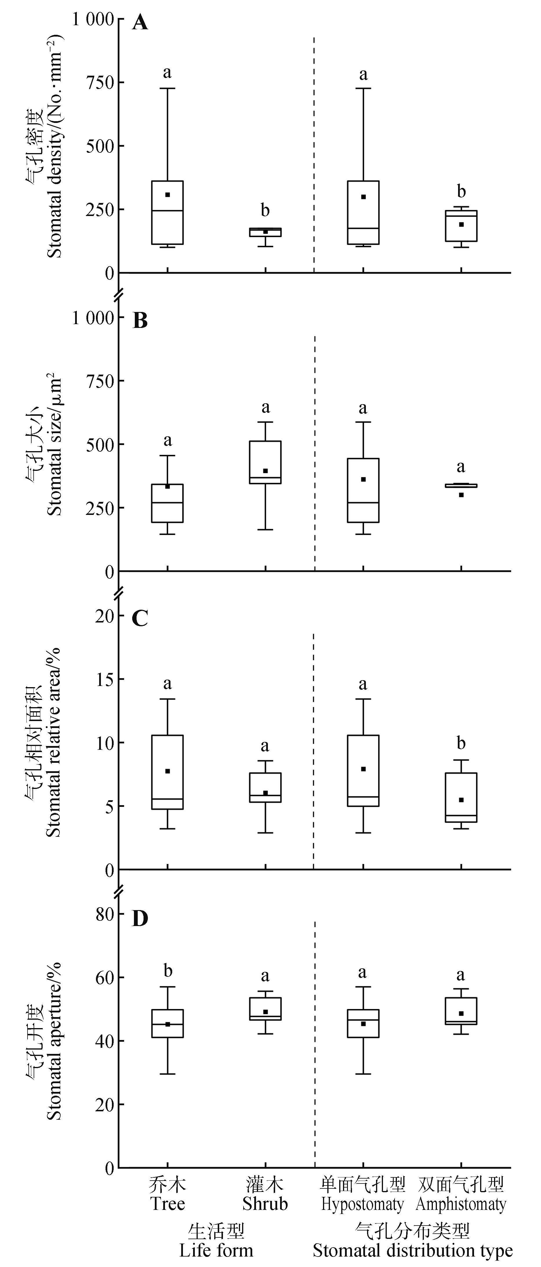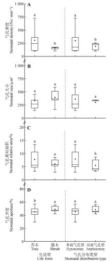 性状 Trait | 生活型 Life form | 气孔分布类型 Stomatal distribution type | ||||||