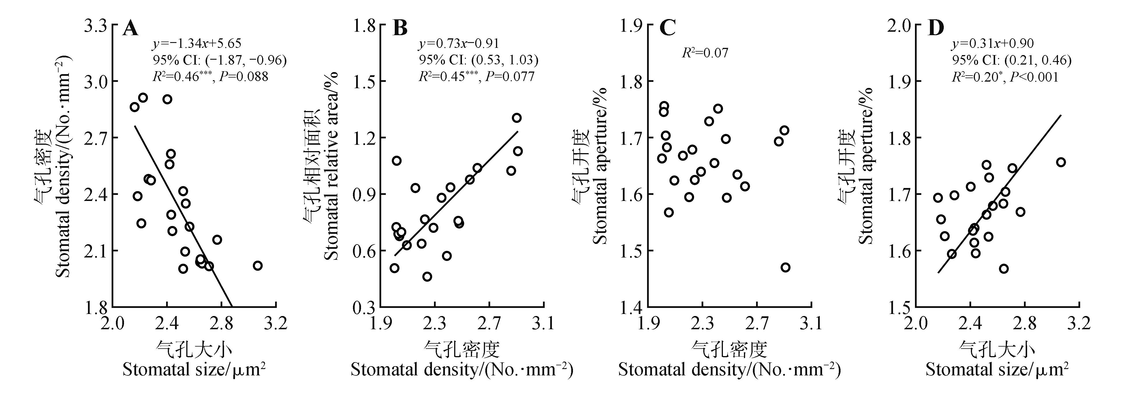 Allometric relations of leaf stomatal traitsAll traits were log-transformed to meet the normality assumption. The CI represented the 95% confidence interval for the slope,the asterisks after R2 (*) indicated significance levels of SMA regression (*. P<0.05;***. P<0.001); values in parentheses showed P for testing slope deviation from 1(or -1),these represented two distinct statistical tests.