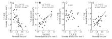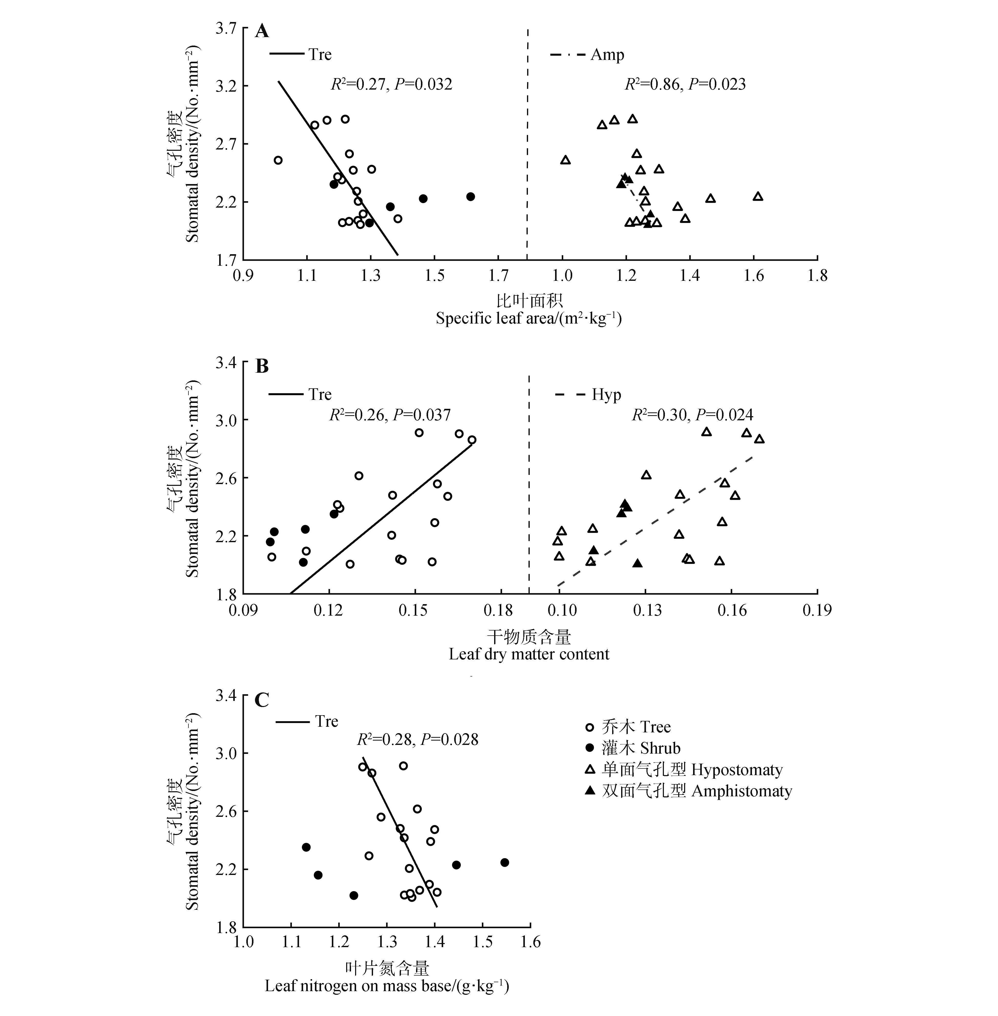 SMA regressions between stomatal density and specific leaf area,leaf nitrogen on mass base and leaf dry matter content of plants with different life forms and stomatal distribution typesAll traits were log-transformed to meet the normality assumption. Only significant regression relationships were listed(P<0.05).