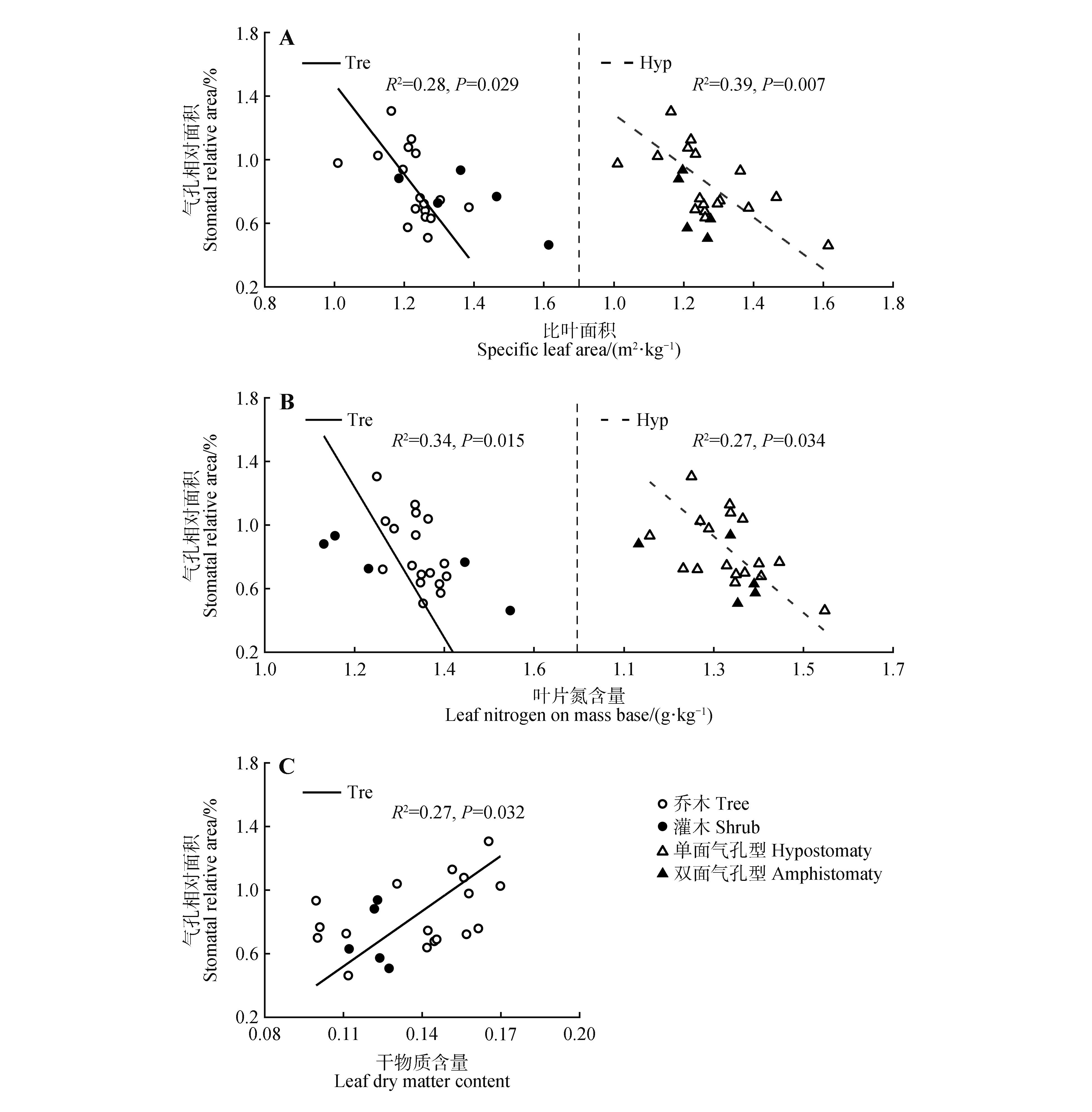 SMA regressions between stomatal relative area and specific leaf area,leaf nitrogen on mass base and leaf dry matter content of plants with different life forms and stomatal distribution typesAll traits were log-transformed to meet the normality assumption. Only significant regression relationships were listed(P<0.05).