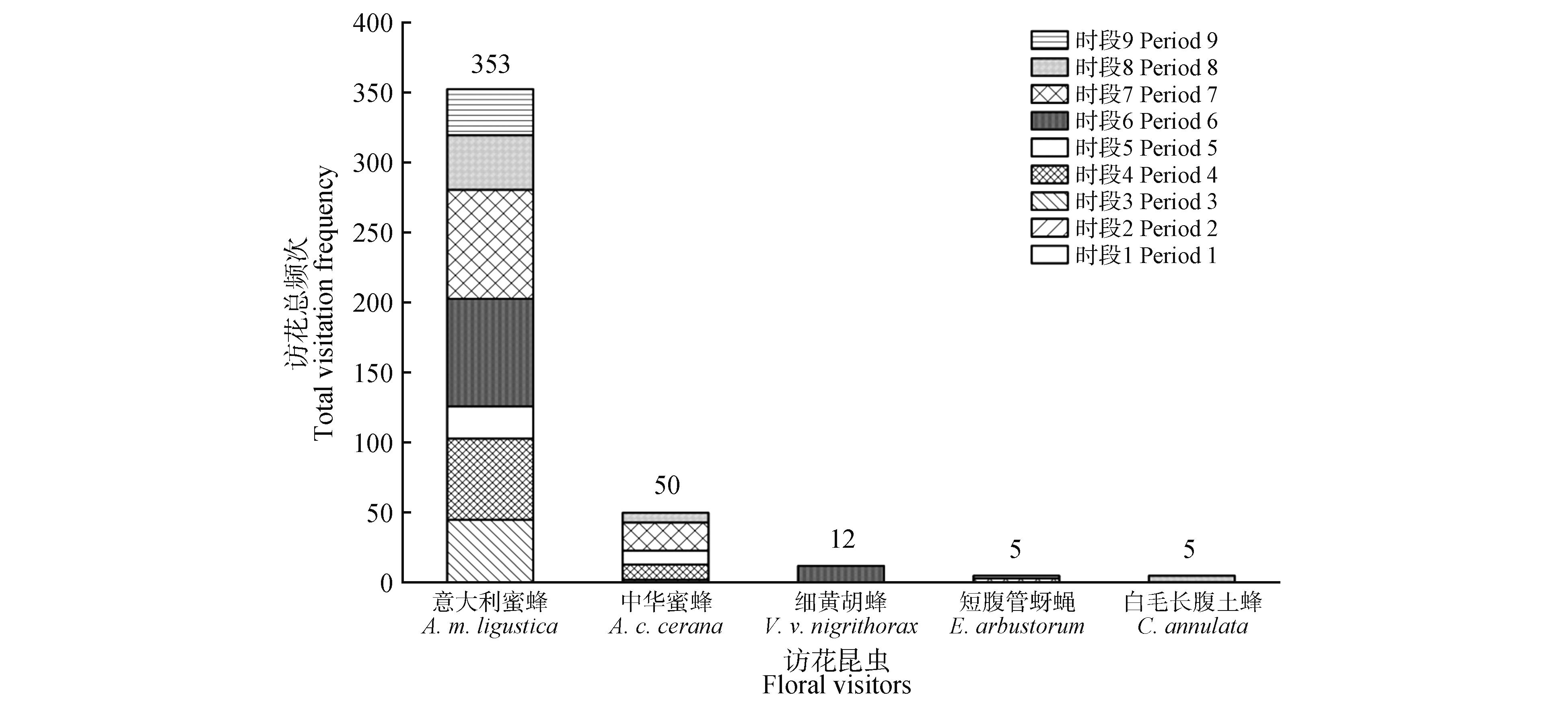 Floral visitation frequency of various floral visitorsin C. incana recorded across nine time periodsThe nine time periods were: Period 1(07:00-07:15),Period 2(07:30—07:45),Period 3(08:00—08:15),Period 4(11:00—11:15),Period 5(11:30—11:45),Period 6(12:00—12:15),Period 7(15:00—15:15),Period 8(15:30—15:45),and Period 9(16:00—16:15).