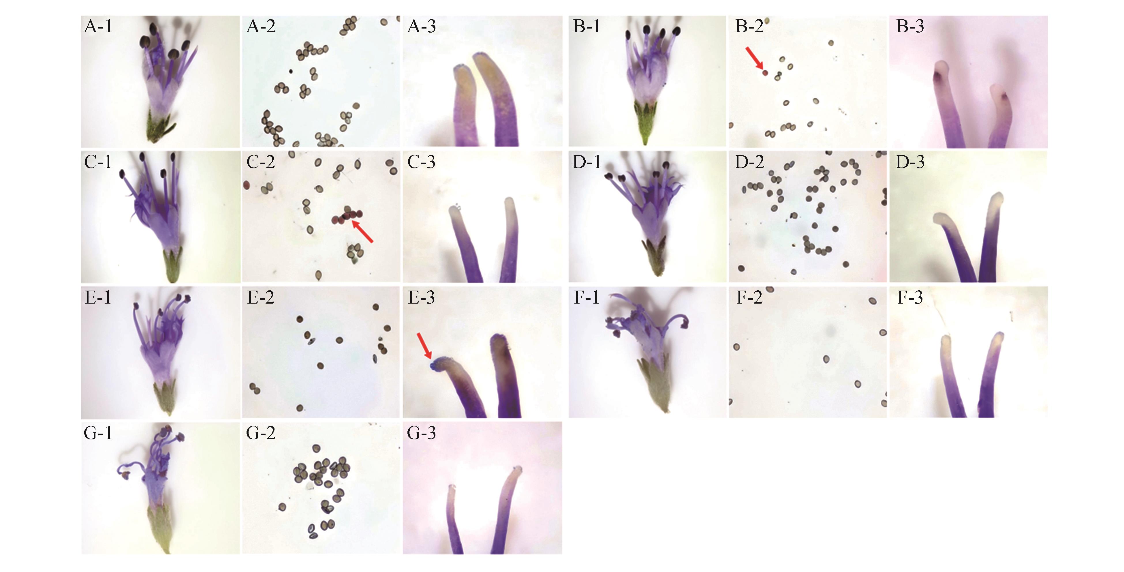 Changes in flora morphology, pollen viability, and stigma receptivity from Day 1 to Day 7 of C. incanaFrom left to right showing the daily flower morphology display, pollen viability test results, stigma receptivity test results; A. Flowers opening 1 d; B. Flowers opening 2 d; C. Flower opening 3 d; D. Flowers opening 4 d; E. Flowers opening 5 d; F. Flowers opening 6 d; G, Flowers opening 7 d. The red arrows in Figs. 5B-2 and 5C-2 indicated that the pollen was stained red by TTC dye; the red arrow in Fig. 5E-3 indicated the blue colour of the stigma.