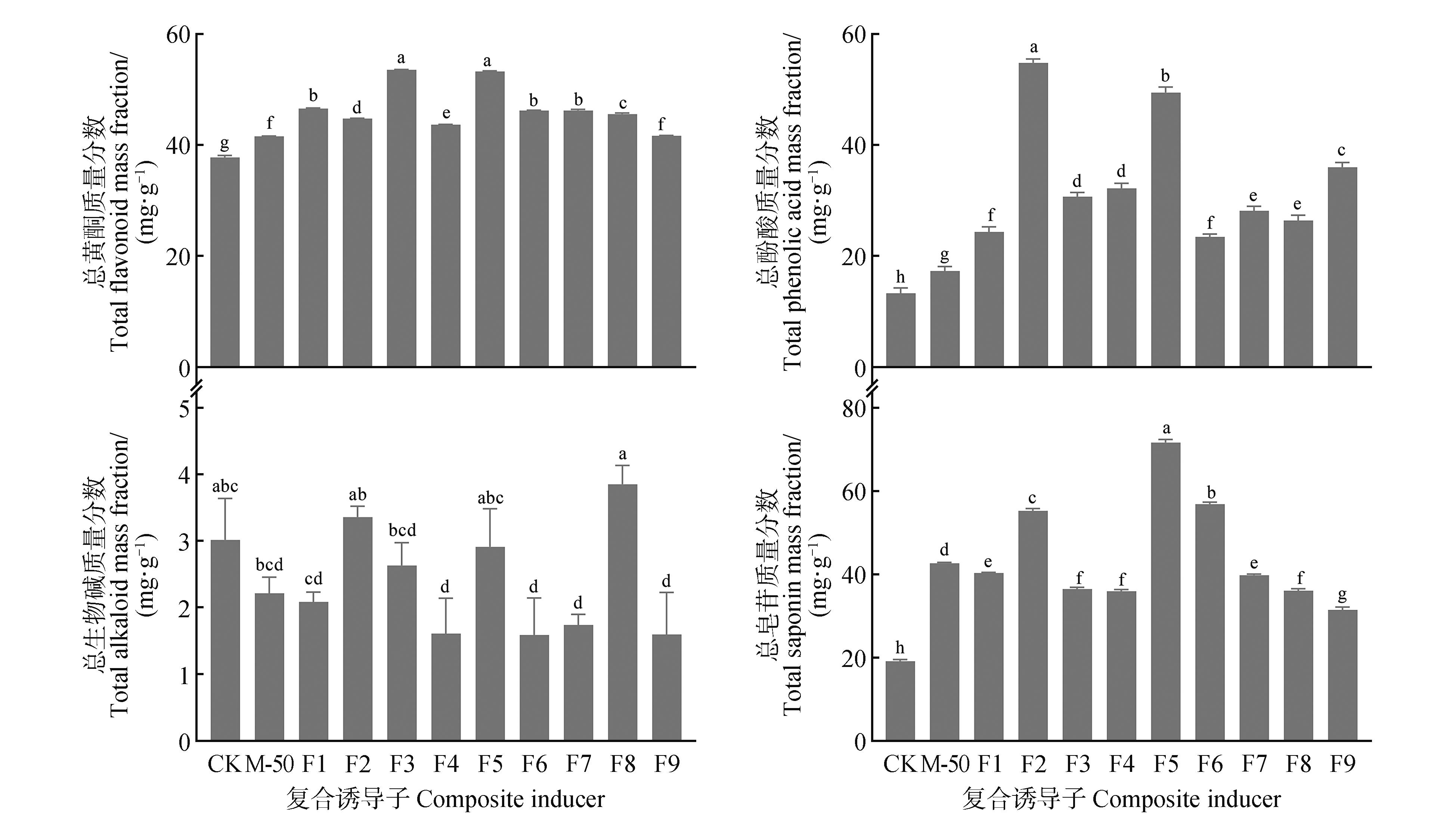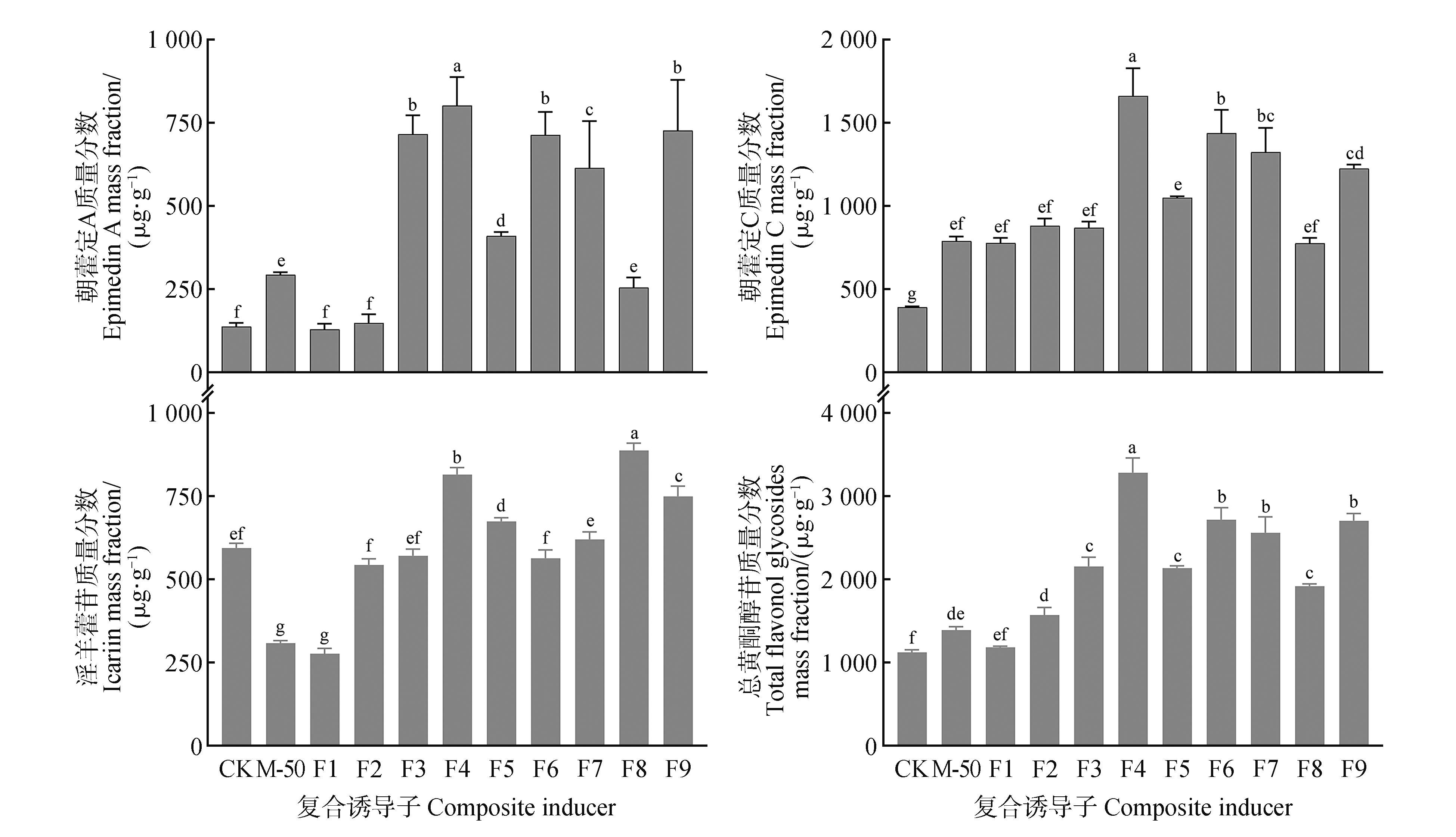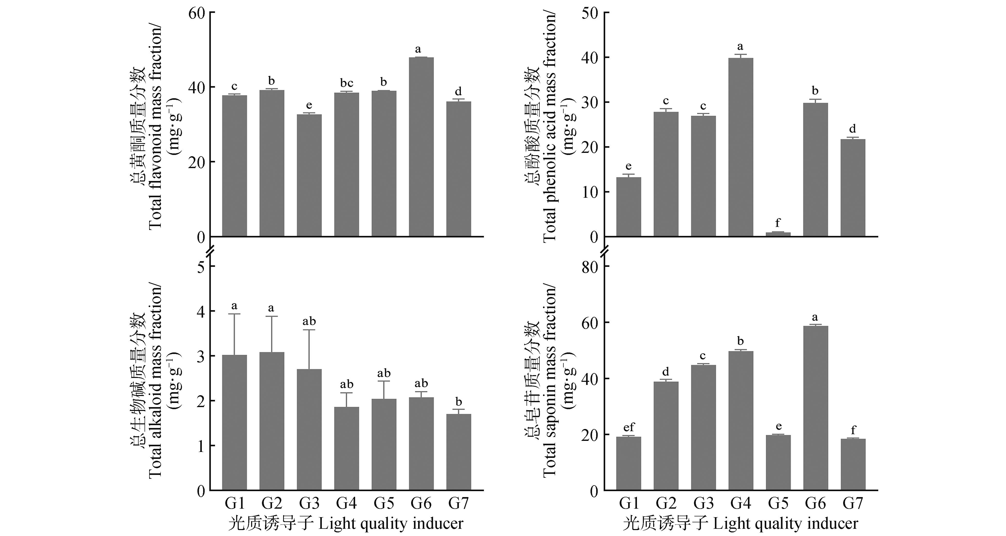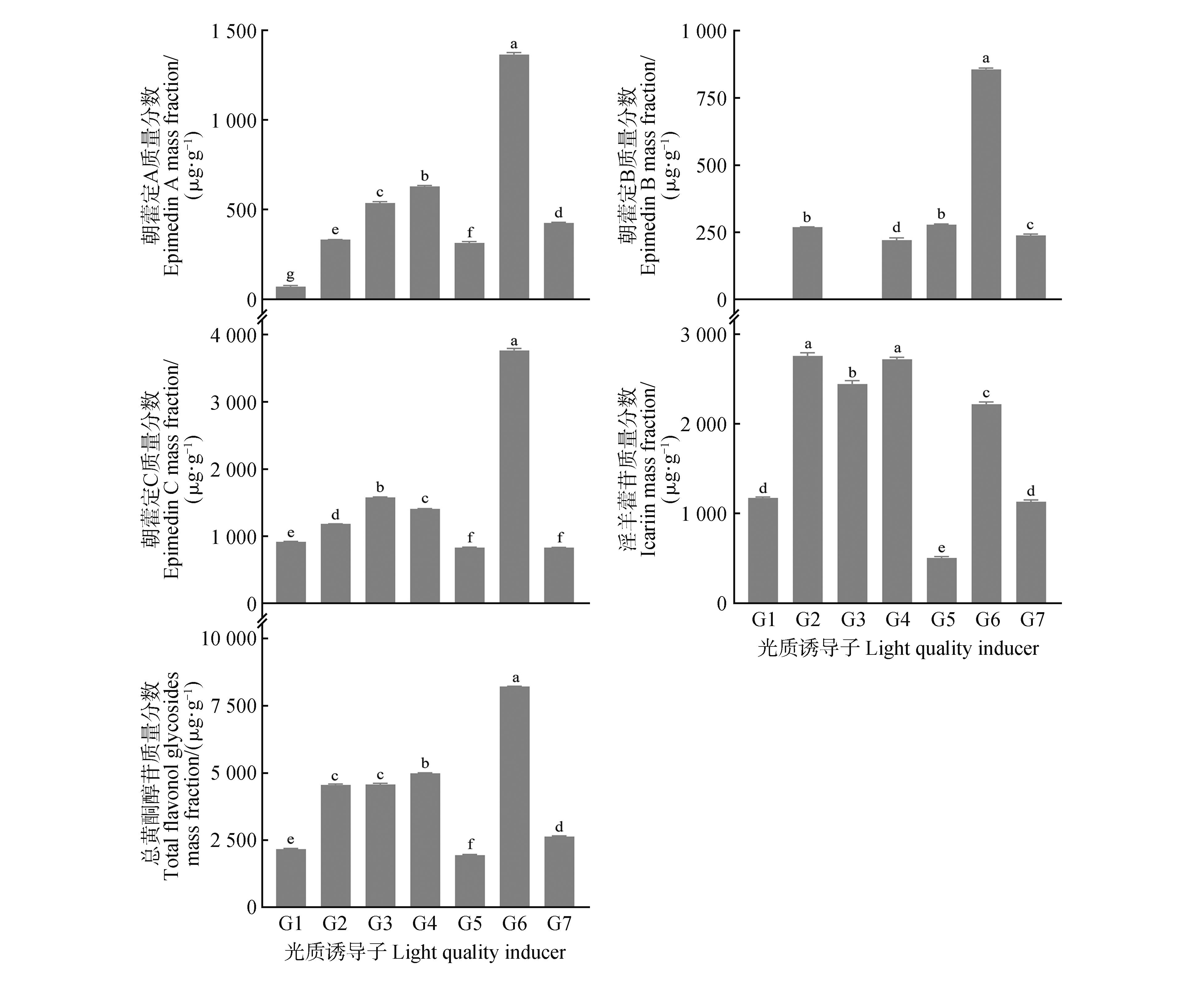 This study investigated the effects of composite inducers at varying concentrations and photomorphogenic inducers under different photoperiods on the major secondary metabolites in Epimedium sagittatum(Sieb. et Zucc.) Maxim. suspension cells. Orthogonal experiments were conducted under optimal culture conditions to evaluate the effects of three composite inducers: MeJA at 25, 50,and 75 μmol⋅L-1; SA at 25, 50, and 75 μmol⋅L-1; and CTS at 0, 10, and 20 mg⋅L-1. Additionally, induction was performed under varying light qualities and photoperiods. The findings demonstrated that the levels of secondary metabolites, including flavonol glycosides, total flavonoids, total phenolic acids, and total saponins, increased in E. sagittatum suspension cells treated with composite inducers and photomorphogenic inducers compared to the control group. The F4 treatment group (50 μmol⋅L-1 MeJA, 25 μmol⋅L-1 SA, 20 mg⋅L-1 CTS) and G6 treatment group (blue light, 16 h) exhibited significantly higher flavonol glycoside content, being 2.92 and 3.79-fold higher than the control, respectively. The F3 treatment group(25 μmol⋅L-1 MeJA, 50 μmol⋅L-1 SA, 10 mg⋅L-1 CTS) and G6 treatment group(blue light, 16 h) demonstrated significantly higher total flavonoid content, approximately 1.42 and 1.27-fold higher than the control, respectively. The F2 treatment group(25 μmol⋅L-1 MeJA, 25 μmol⋅L-1 SA) and G4 treatment group (blue light, 12 h) exhibited significantly elevated total phenolic acid content, being 4.11 and 2.94-fold higher than the control, respectively. The F8 treatment group(75 μmol⋅L-1 MeJA, 75 μmol⋅L-1 SA) and G2 treatment group (white light, 12 h) exhibited higher total alkaloid content, being 1.28 and 1.02-fold higher than the control, respectively. The total saponin content in the F5 treatment group(50 μmol⋅L-1 MeJA, 50 μmol⋅L-1 SA) and G6 treatment group(blue light, 16 h) was significantly higher, being 3.73 and 3.05-fold higher than the control, respectively. These results indicated that the application of exogenous inducers effectively enhanced the synthesis and accumulation of secondary metabolites, such as flavonoids and total saponins, in E. sagittatum.