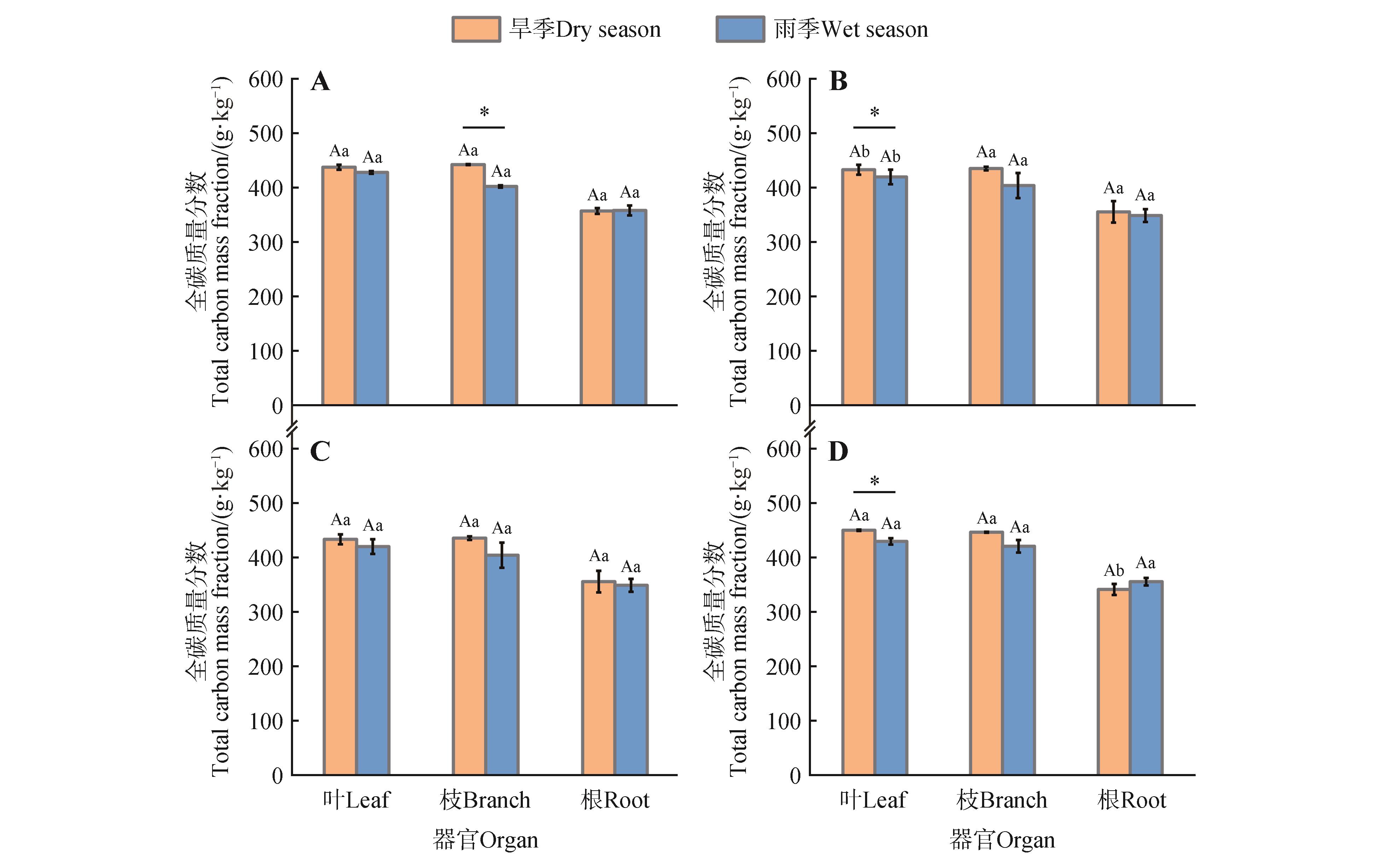 Mass fraction of total carbon in each organ of Laguncularia racemosa and Avicennia marina in pure-(A,B)and mixed-(C,D)stands across seasonsA. Laguncularia racemosa pure stand;B. Avicennia marina pure stand;C. L. racemosa mixed stand;D. A. marina mixed stand. Different uppercase letters indicated significant differences between species within the same season and organ(P<0.05). Different lowercase letters indicated significant differences between stand types within the same species and organ. Asterisks (*) indicated significant differences between seasons within the same stand type and organ. The same as below.
