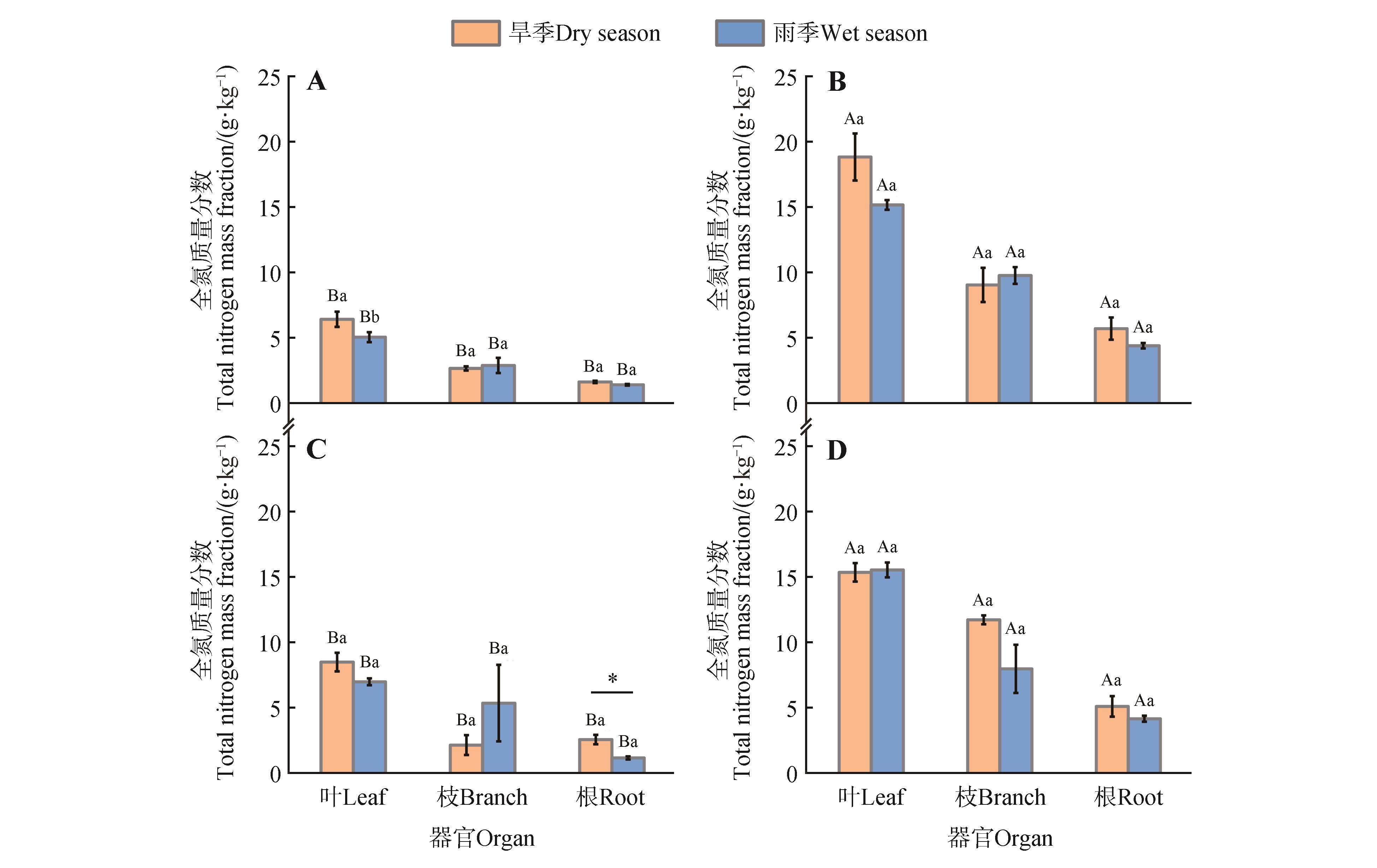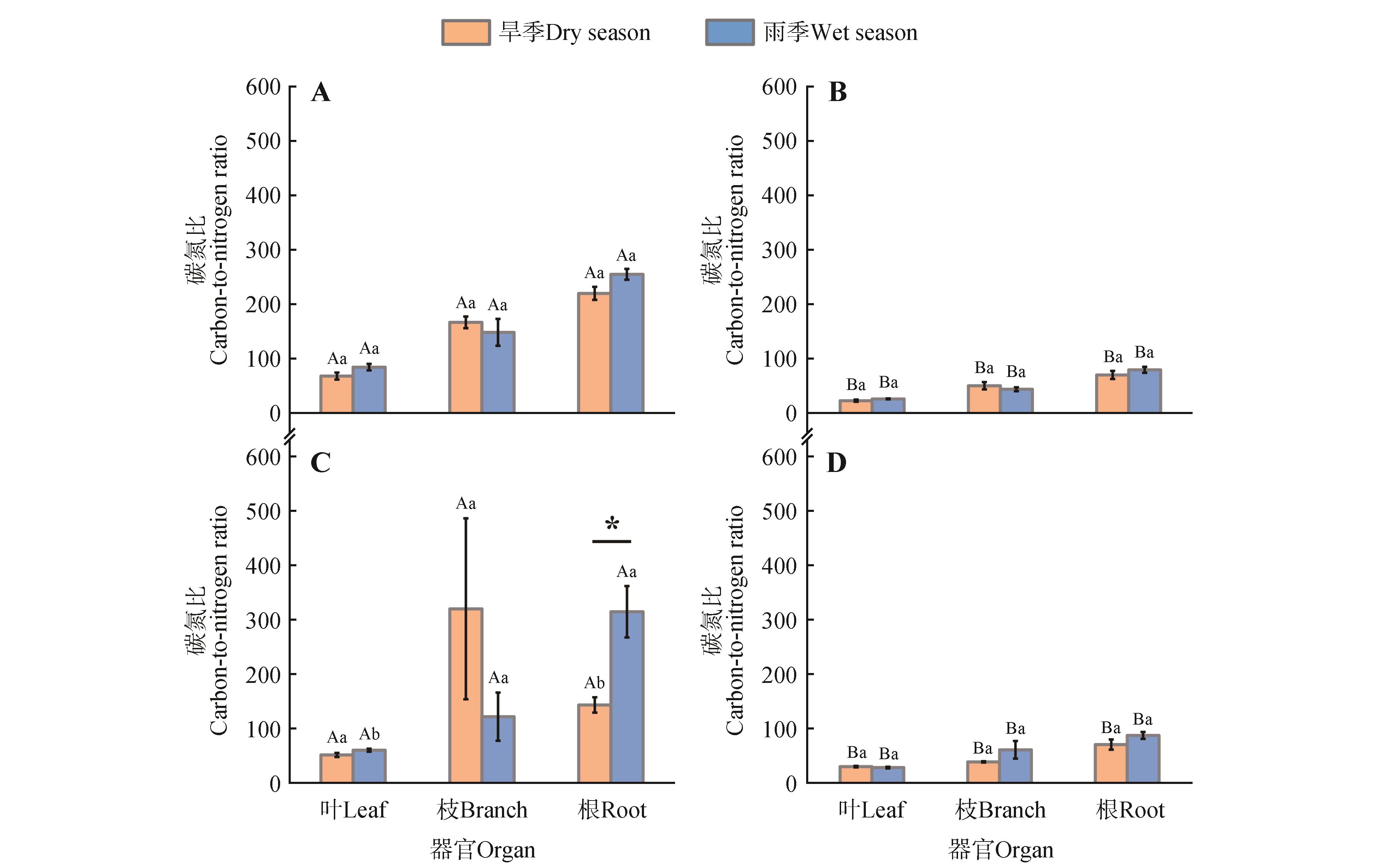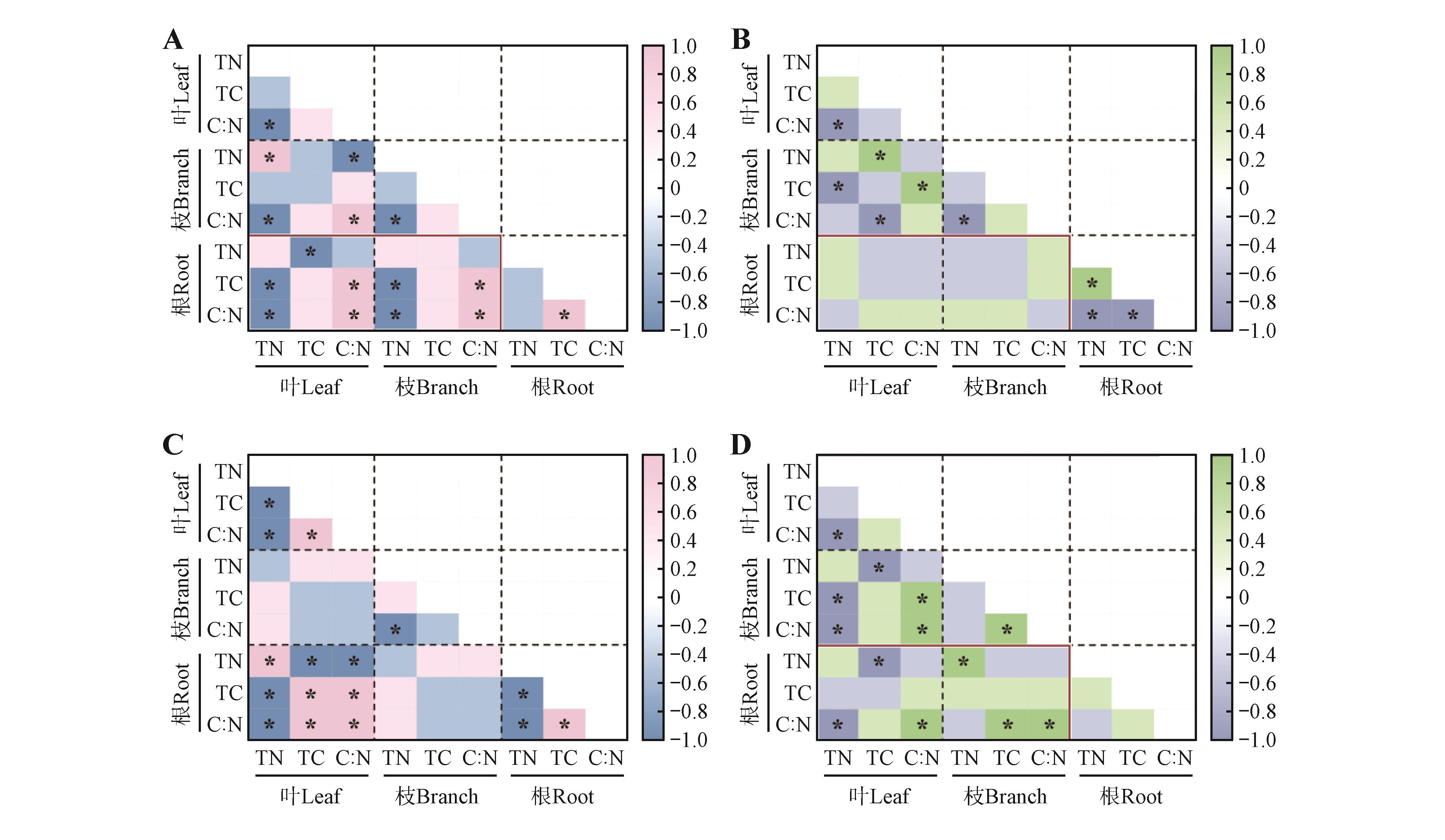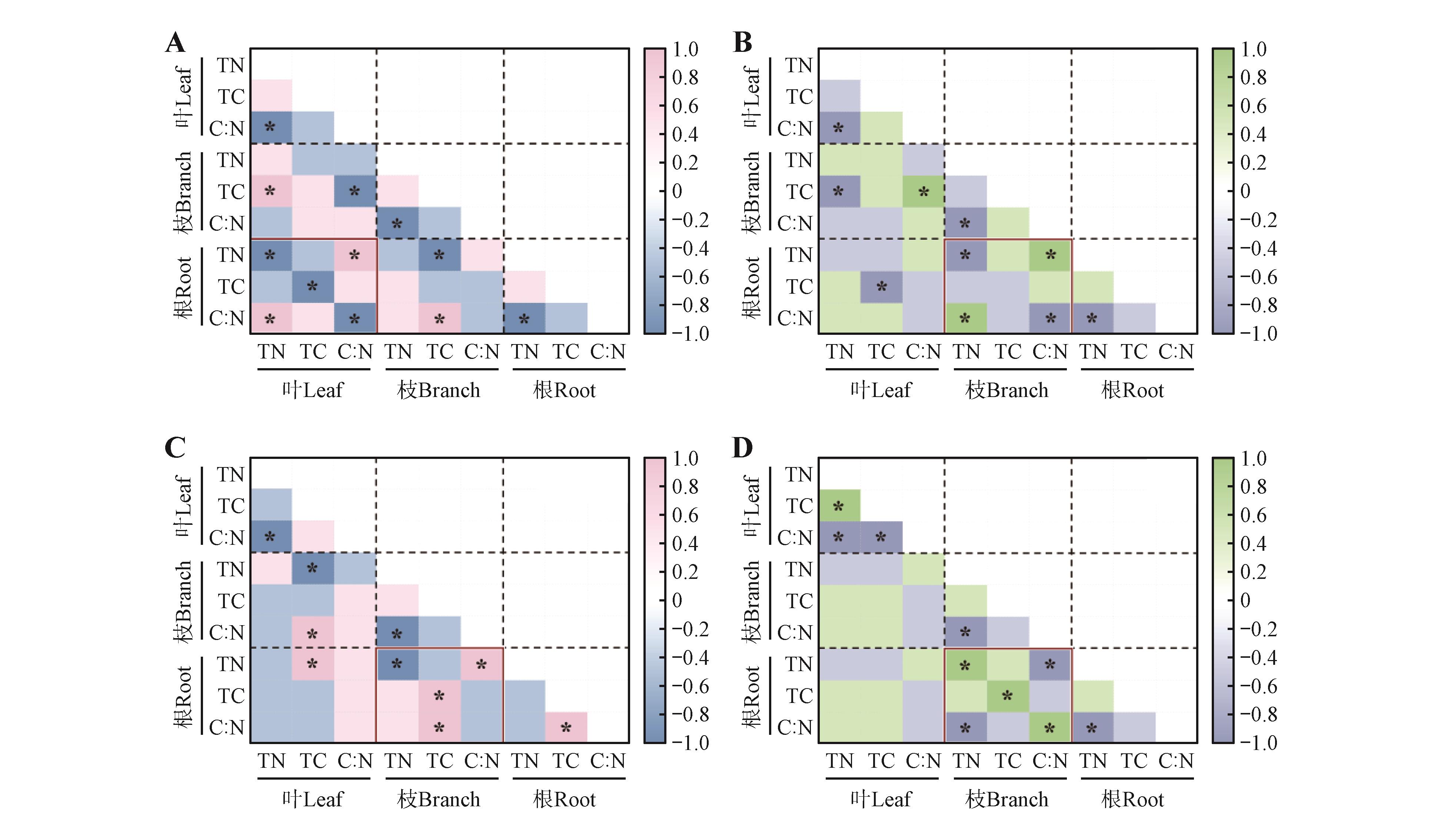 Correlations among organ carbon and nitrogen contents,and carbon-to-nitrogen ratios of Laguncularia racemosa in pure-(A,B)and mixed-(C,D)stands across seasonsA. Pure stand in the wet season;B. Pure stand in the dry season;C. Mixed stand in the wet season;D. Mixed stand in the dry season. TN. Total nitrogen content;TC. Total carbon content;C∶N.Carbon-to-nitrogen ratio;*.P<0.05. The same as below.