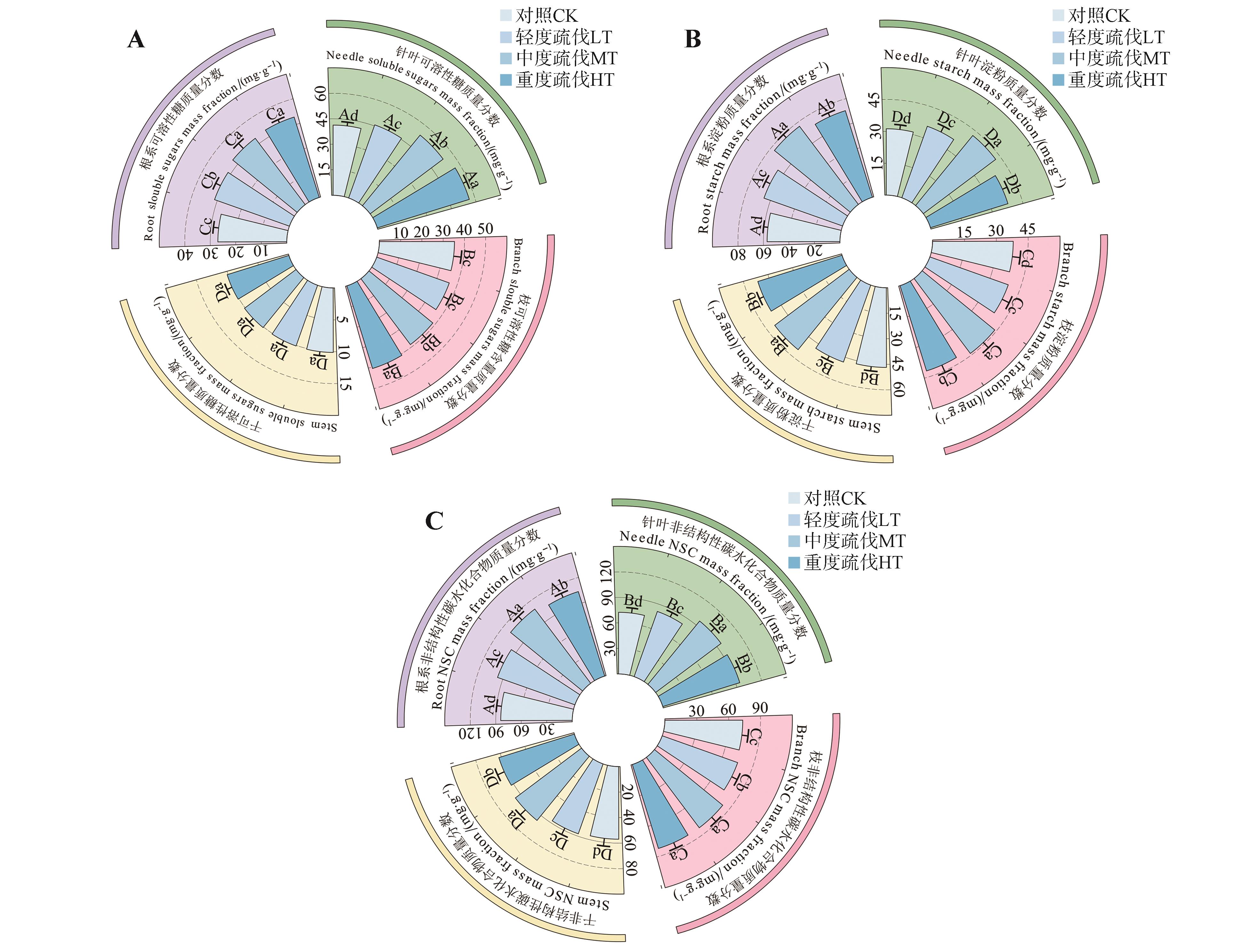 Non-structural carbohydrate mass fraction in different organs of P. koraiensis under different thinning treatmentsA-C represented the mass fraction of soluble sugars, starch, and NSC in each organ, respectively. Different capital letters indicated significant differences among different organs under the same treatment(P<0.05), while different lowercase letters indicated significant differences within the same organ under different treatments(P<0.05).