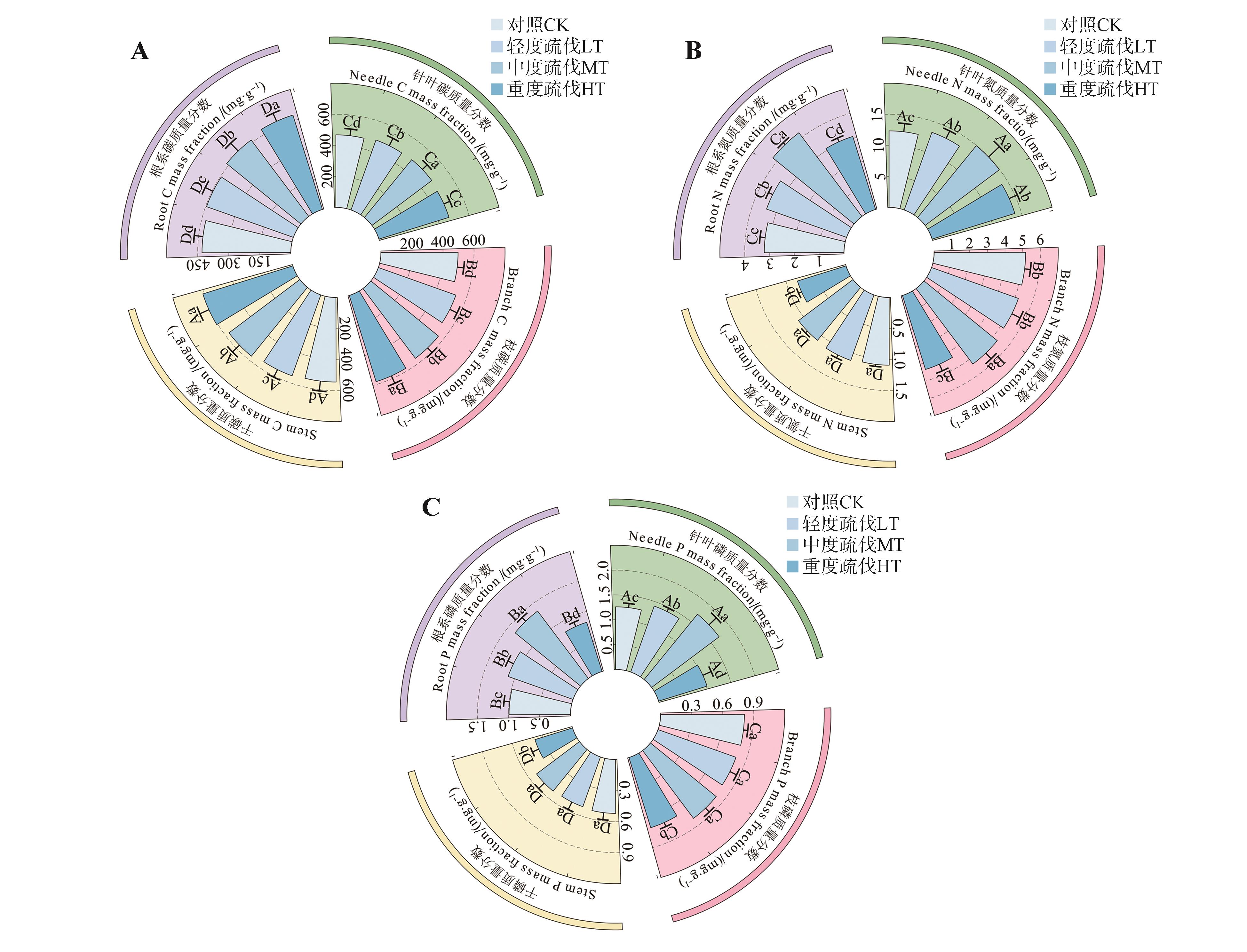 Mass fraction of carbon,nitrogen and phosphorus in P. koraiensis under different thinning treatmentsA-C represented the mass fraction of C,N and P in each organ, respectively. Different capital letters indicated significant differences among different organs under the same treatment(P<0.05), while different lowercase letters indicated significant differences within the same organ under different treatments(P<0.05).