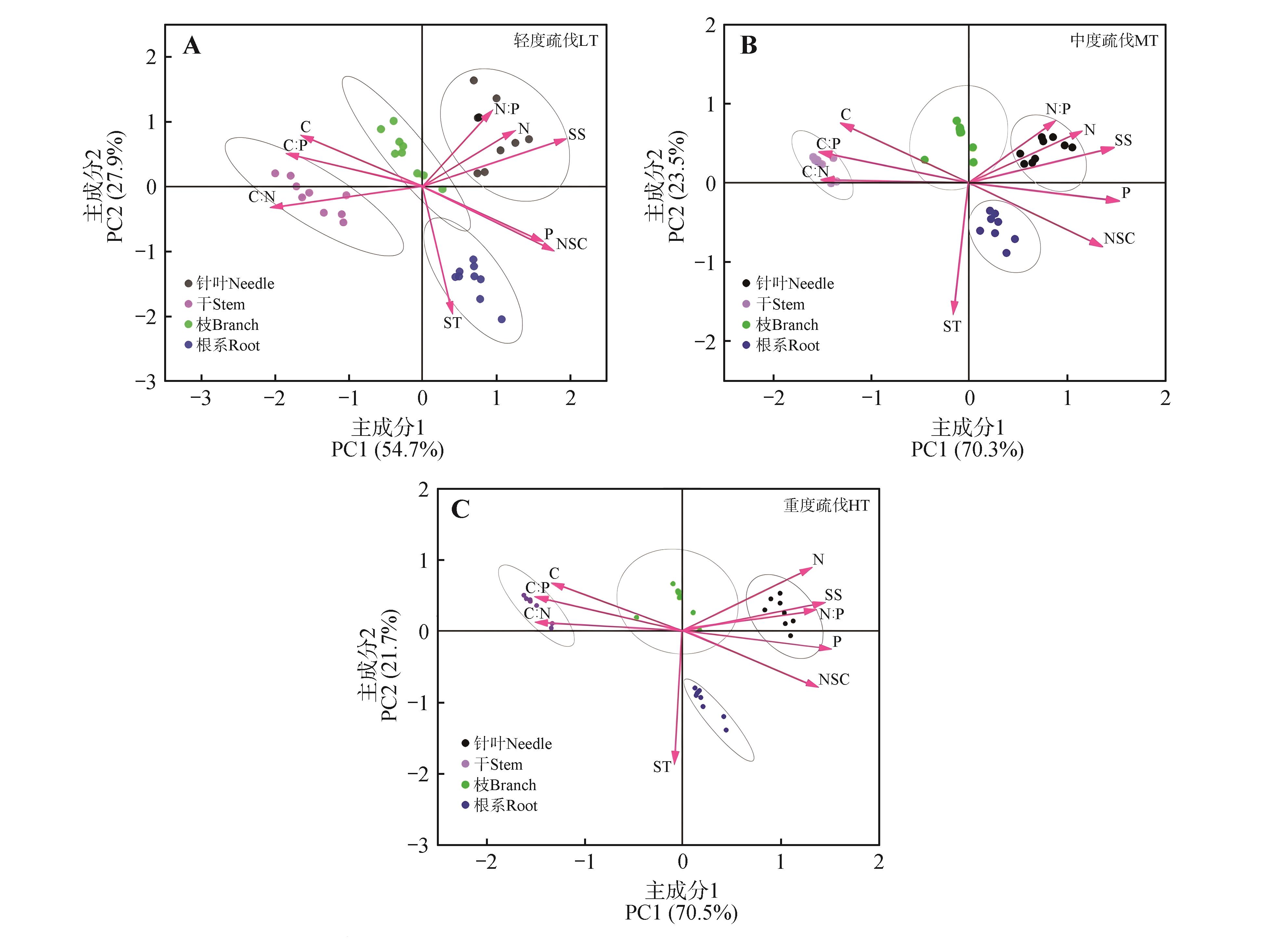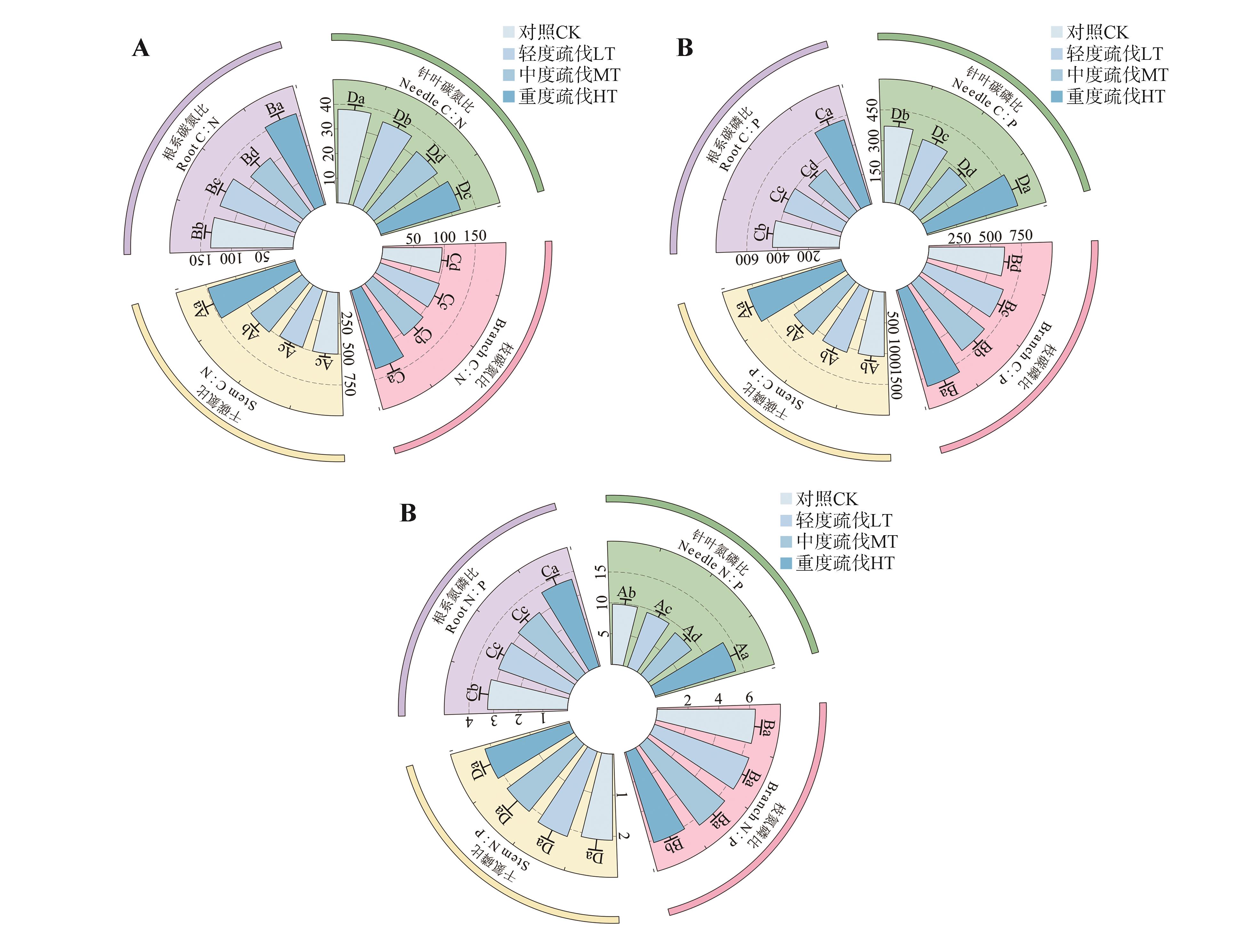 Stoichiometric ratios of C,N and P in P. koraiensis resulting from different thinning treatmentsA-C represented the C∶N, C∶P and N∶P ratios of each organ, respectively. Different capital letters indicated significant differences among different organs under the same treatment(P<0.05), while different lowercase letters indicated significant differences within the same organ under different treatments(P<0.05).